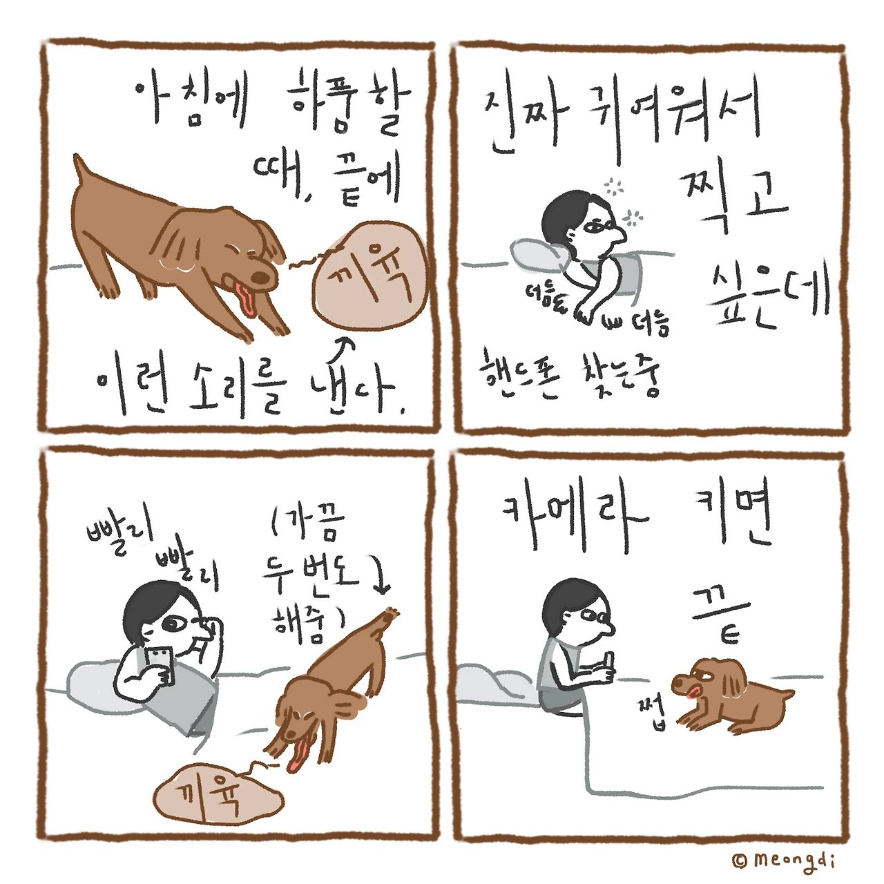 본업은 그래픽 디자이너. 취미로 그림을 그려요. 갈색푸들 키니와 함께하는 일상 <키니일기> 연재중. instagram @meongdi