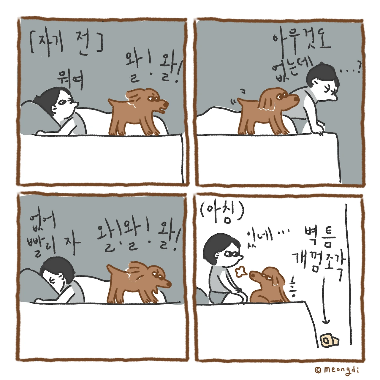 본업은 그래픽 디자이너. 취미로 그림을 그려요. 갈색푸들 키니와 함께하는 일상 <키니일기> 연재중. instagram @meongdi