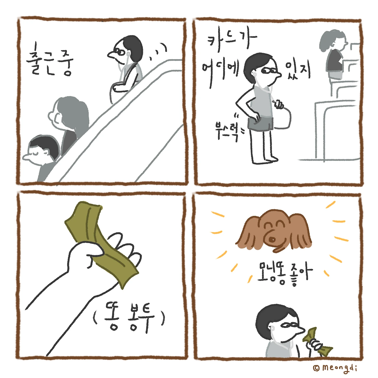 본업은 그래픽 디자이너. 취미로 그림을 그려요. 갈색푸들 키니와 함께하는 일상 <키니일기> 연재중. instagram @meongdi
