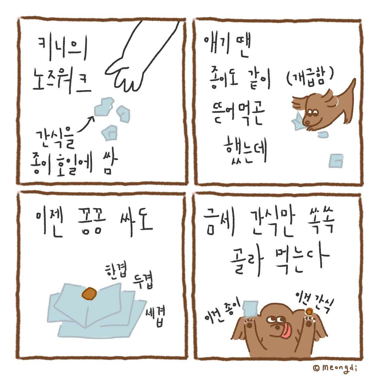 본업은 그래픽 디자이너. 취미로 그림을 그려요. 갈색푸들 키니와 함께하는 일상 <키니일기> 연재중. instagram @meongdi