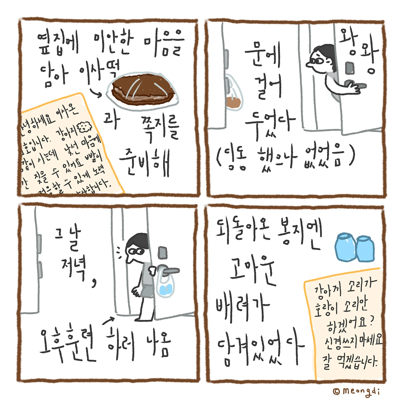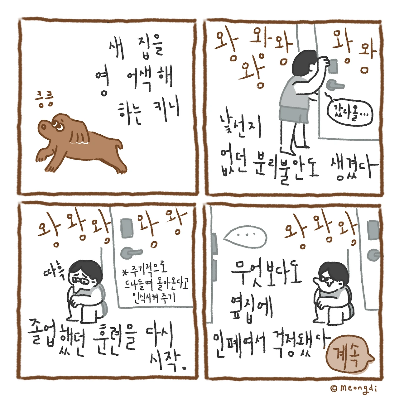 본업은 그래픽 디자이너. 취미로 그림을 그려요. 갈색푸들 키니와 함께하는 일상 <키니일기> 연재중. instagram @meongdi