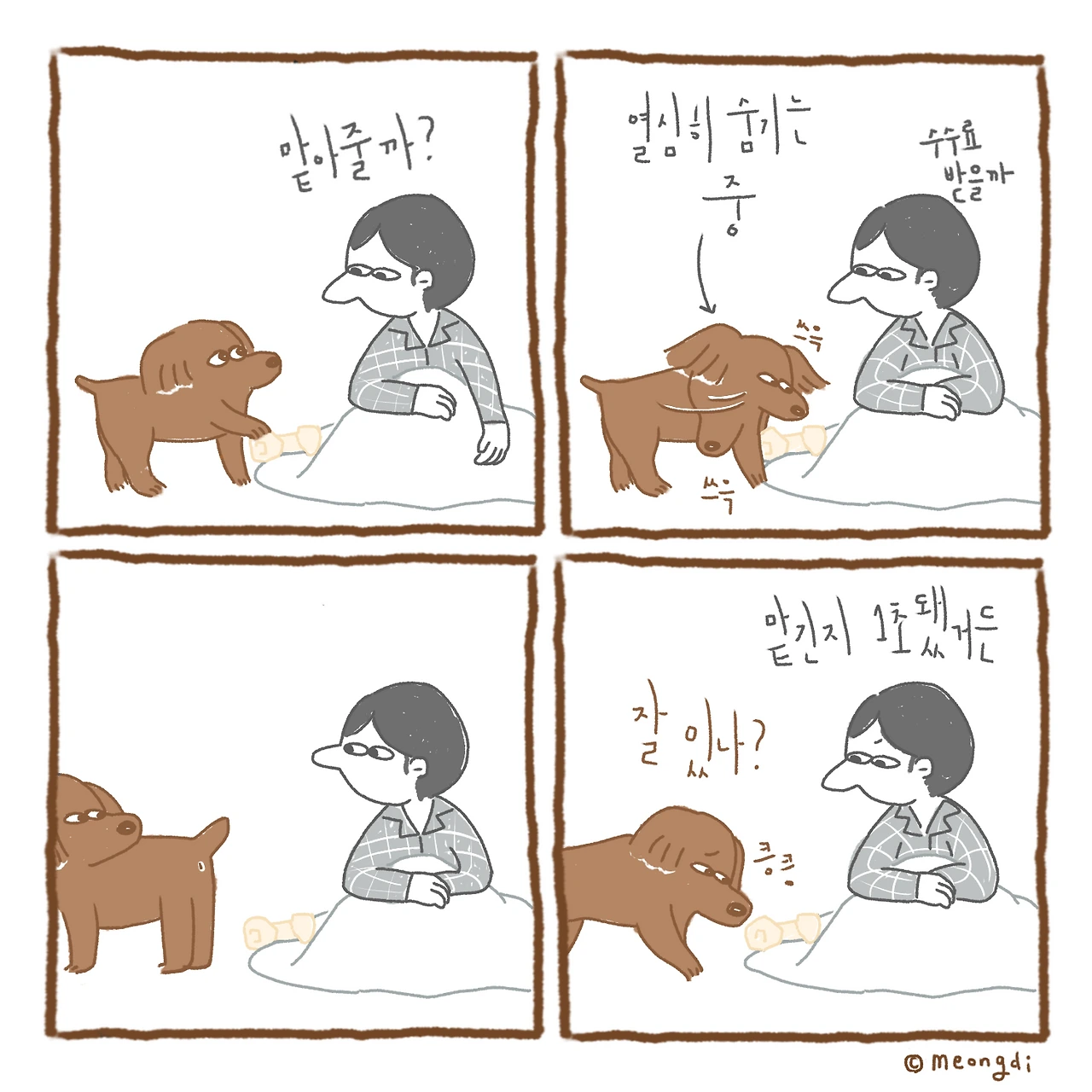 본업은 그래픽 디자이너. 취미로 그림을 그려요. 갈색푸들 키니와 함께하는 일상 <키니일기> 연재중. instagram @meongdi