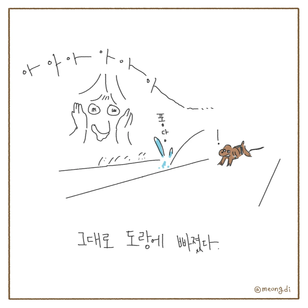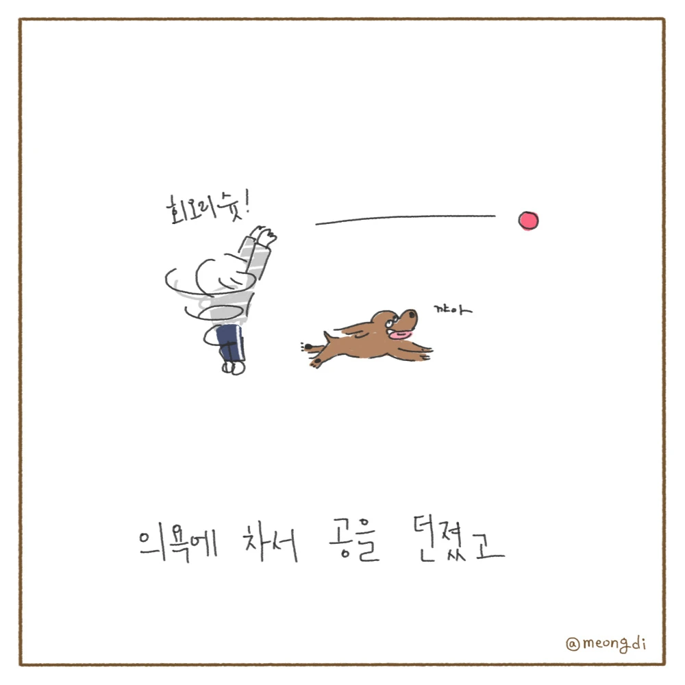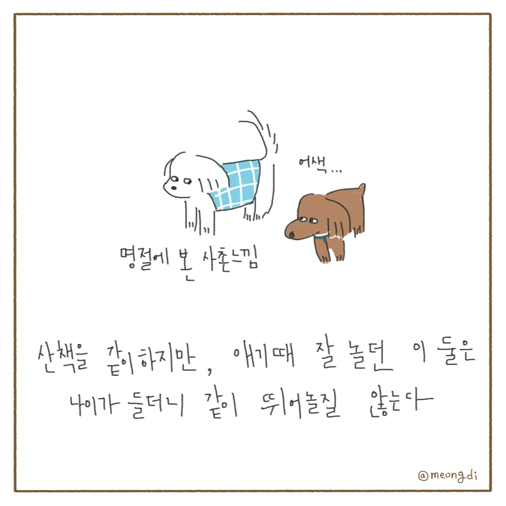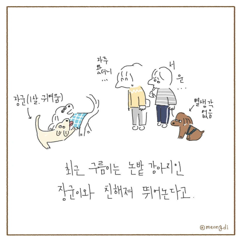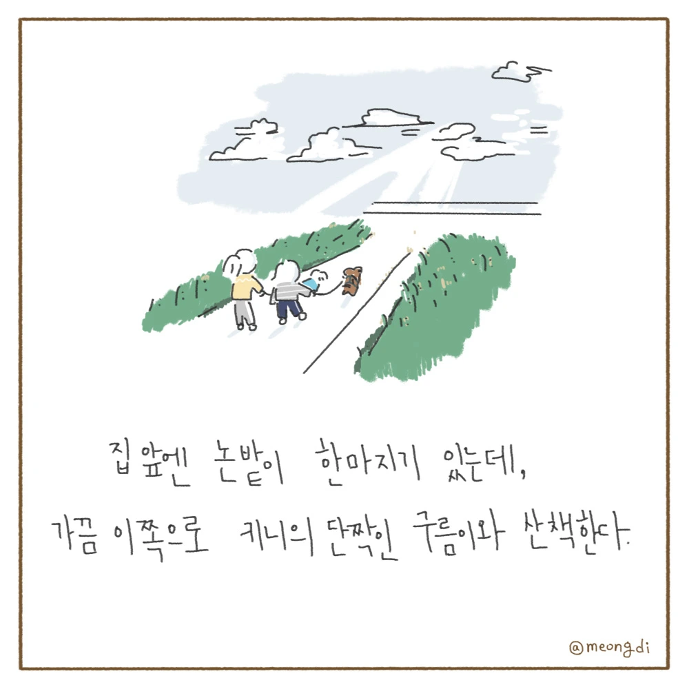 본업은 그래픽 디자이너. 취미로 그림을 그려요. 갈색푸들 키니와 함께하는 일상 <키니일기> 연재중. instagram @meongdi