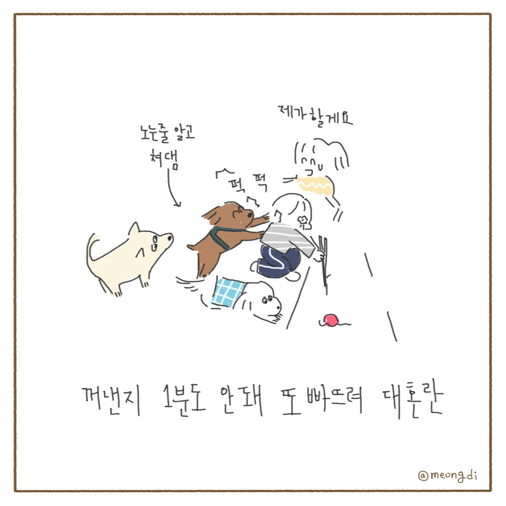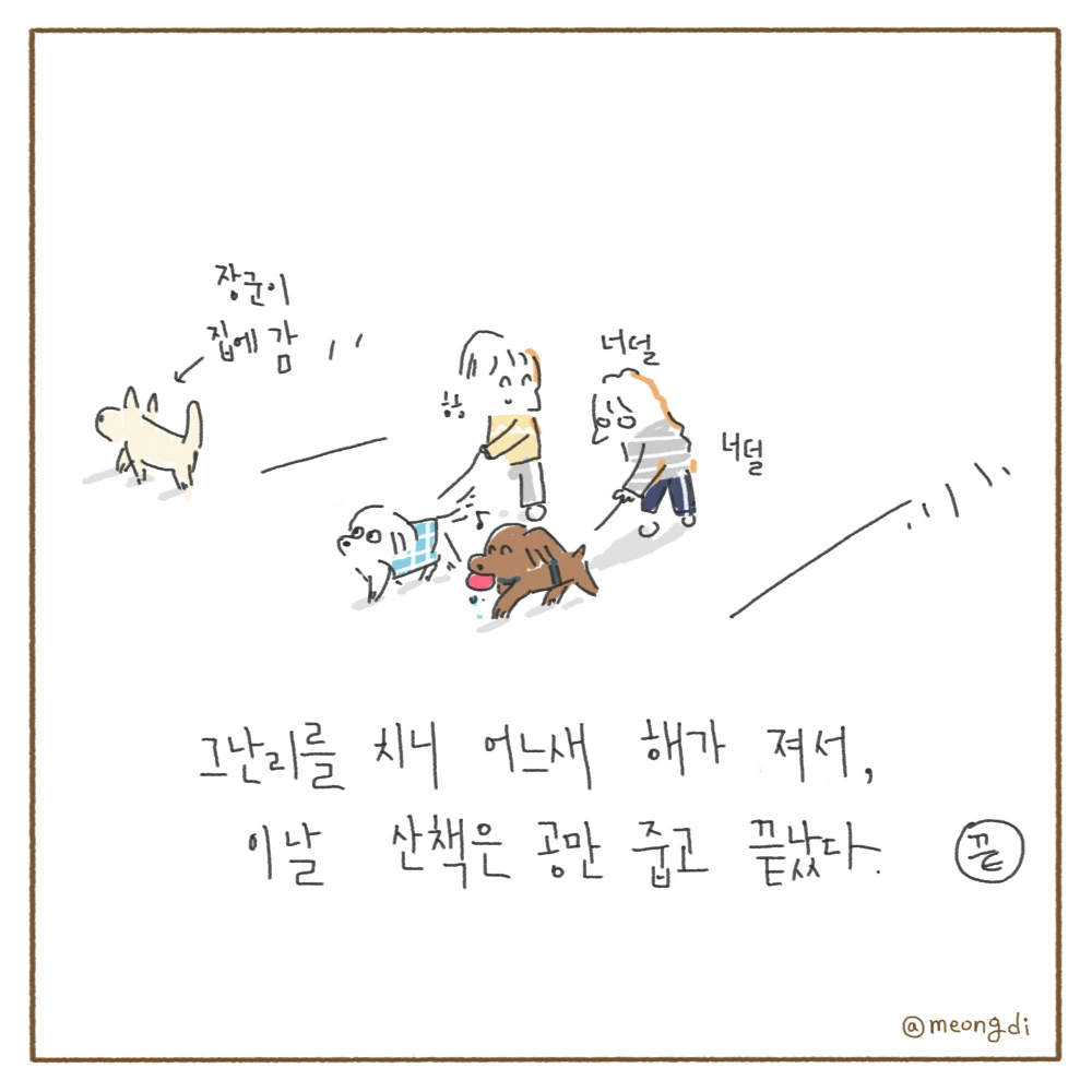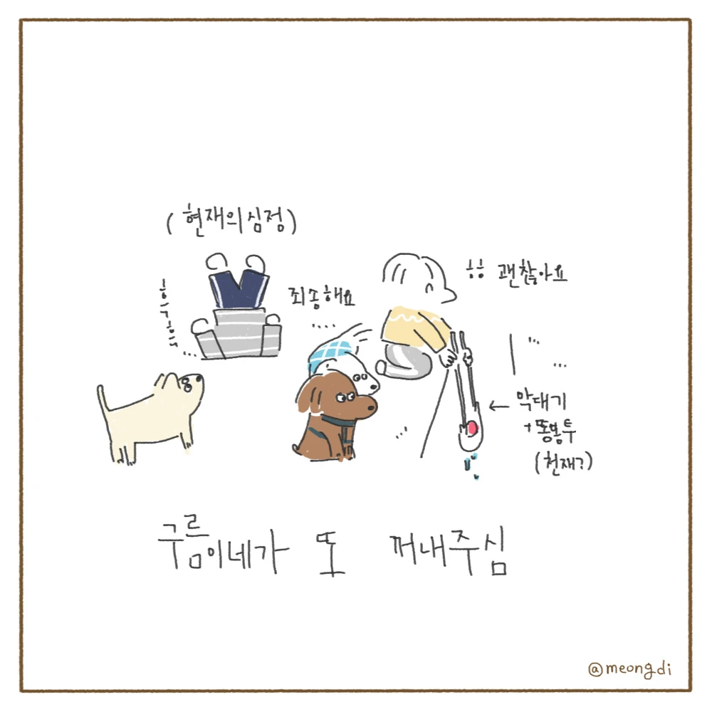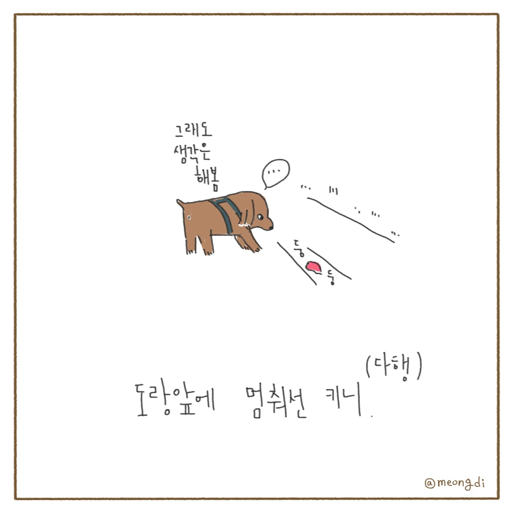 본업은 그래픽 디자이너. 취미로 그림을 그려요. 갈색푸들 키니와 함께하는 일상 <키니일기> 연재중. instagram @meongdi