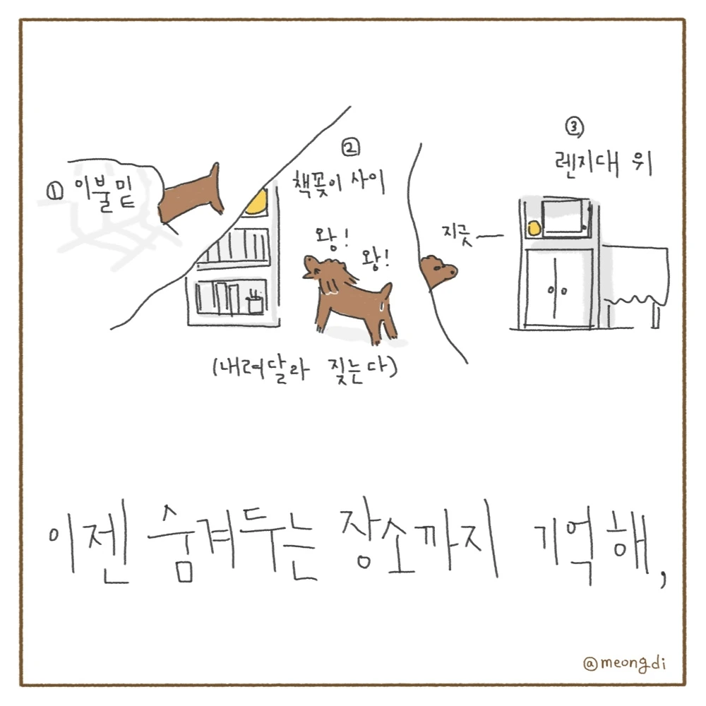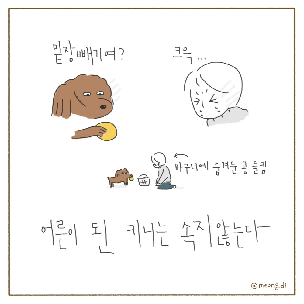 본업은 그래픽 디자이너. 취미로 그림을 그려요. 갈색푸들 키니와 함께하는 일상 <키니일기> 연재중. instagram @meongdi