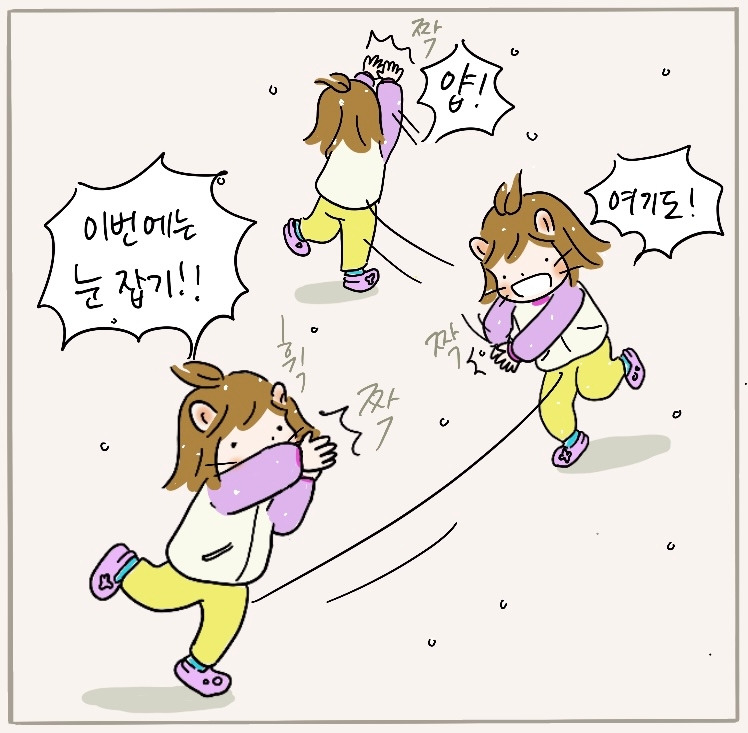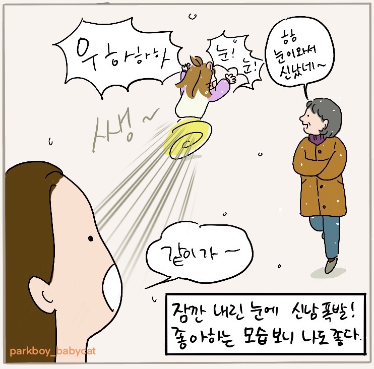 어제 잠깐 내린 눈에 아기고양이가 신났어요.