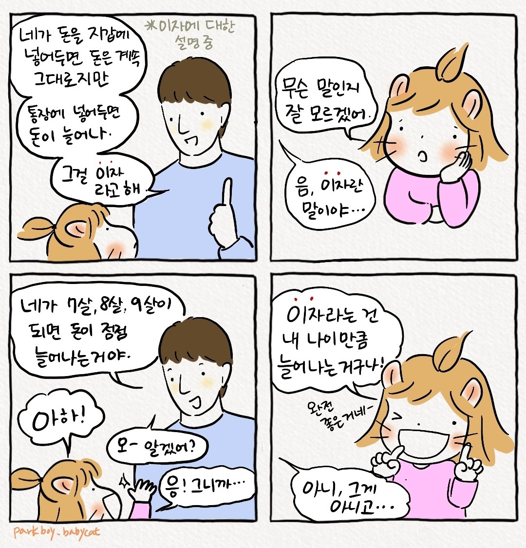 통장에 저금하면 이자가 쌓인다고 설명해 주는 중.
