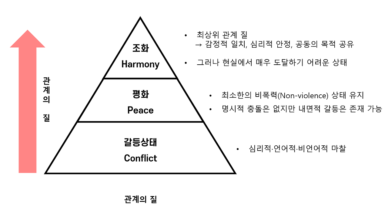 팀의 모든 활동은 ‘관계’ 위에서 이루어진다. 관계의 질이 좋으면, 갈등도 생산적으로 다루어지고, 의사결정은 빠르며, 변화에 대한 수용력도 높아진다. 반면, 관계가 끊기거나 왜곡되면, 아무리 좋은 전략과 자원이 있어도 실행되지 않는다. ‘관계’는 단지 감정적인 친밀감만을 뜻하지 않는다. 누구와 무엇을 이야기할 수 있는가, 신뢰와 존중이 흐르는 대화가 가능한가, 역할과 책임이 관계 속에서 분명히 공유되는가, 이런 요소들이 보이지 않는 신경망처럼 팀을 움직인다.