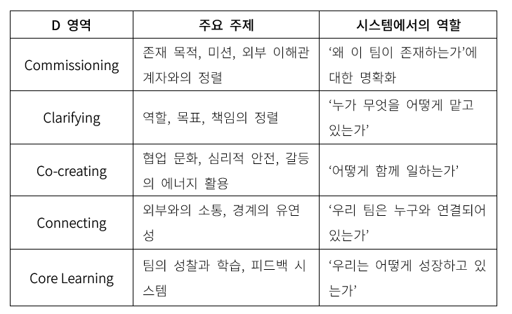 이 다섯 가지 D는 각각 팀의 시스템을 구성하는 다른 축들이다. 하나라도 균형이 무너지면 전체가 흔들릴 수 있다. 반대로 하나의 축을 정렬하면 다른 축에도 연쇄적으로 긍정적 영향이 파급된다. 이것이 바로 ‘시스템적 개입’이 갖는 힘이다.