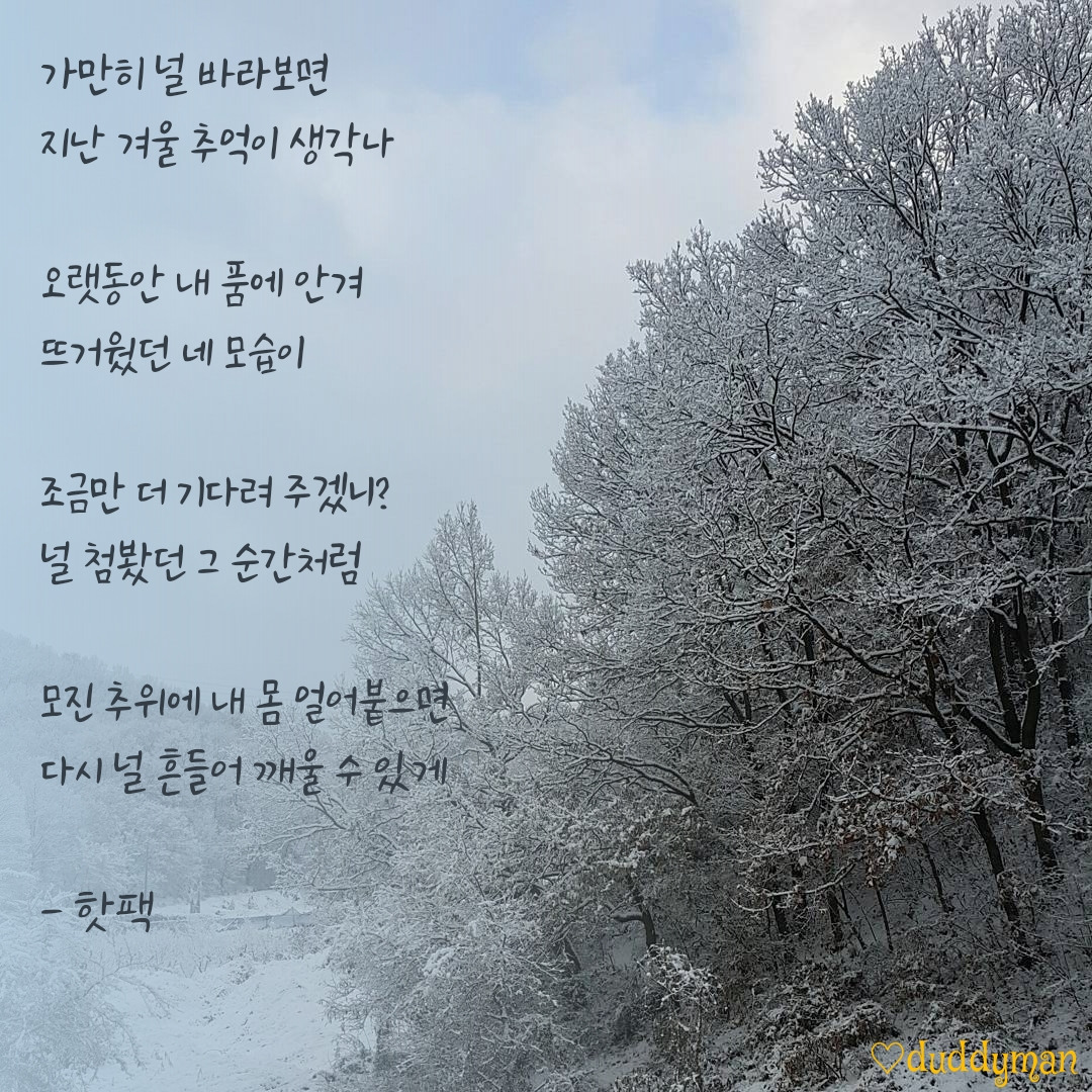 창고를 정리하다 작년에 쓰고 남은 핫팩을 보았다. 즐겨 사용하는 편은 아니지만 몸도 마음도 얼어붙는 날엔 정말 위안이 되는 녀석이다. 아프지 않게 흔들께~ 마냥 뜨겁지만 말고 오래도록 따뜻하렴, 딱 내 체온만큼만....,