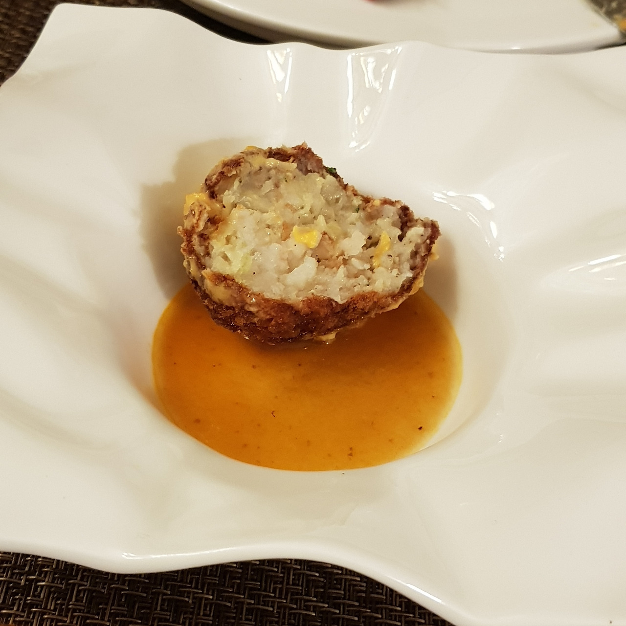 먼저 접시가 나오고 비스크 소스를 부어준다. 4시에 오는 어린왕자를 3시부터 설레라고 말해주는 듯 하다. 어쩌면 새우껍질과 새우머리로 만들어 낸 비스크소스가 감자와 새우로 만든 크로켓을 기다리는 건 당연한지도 모른다.