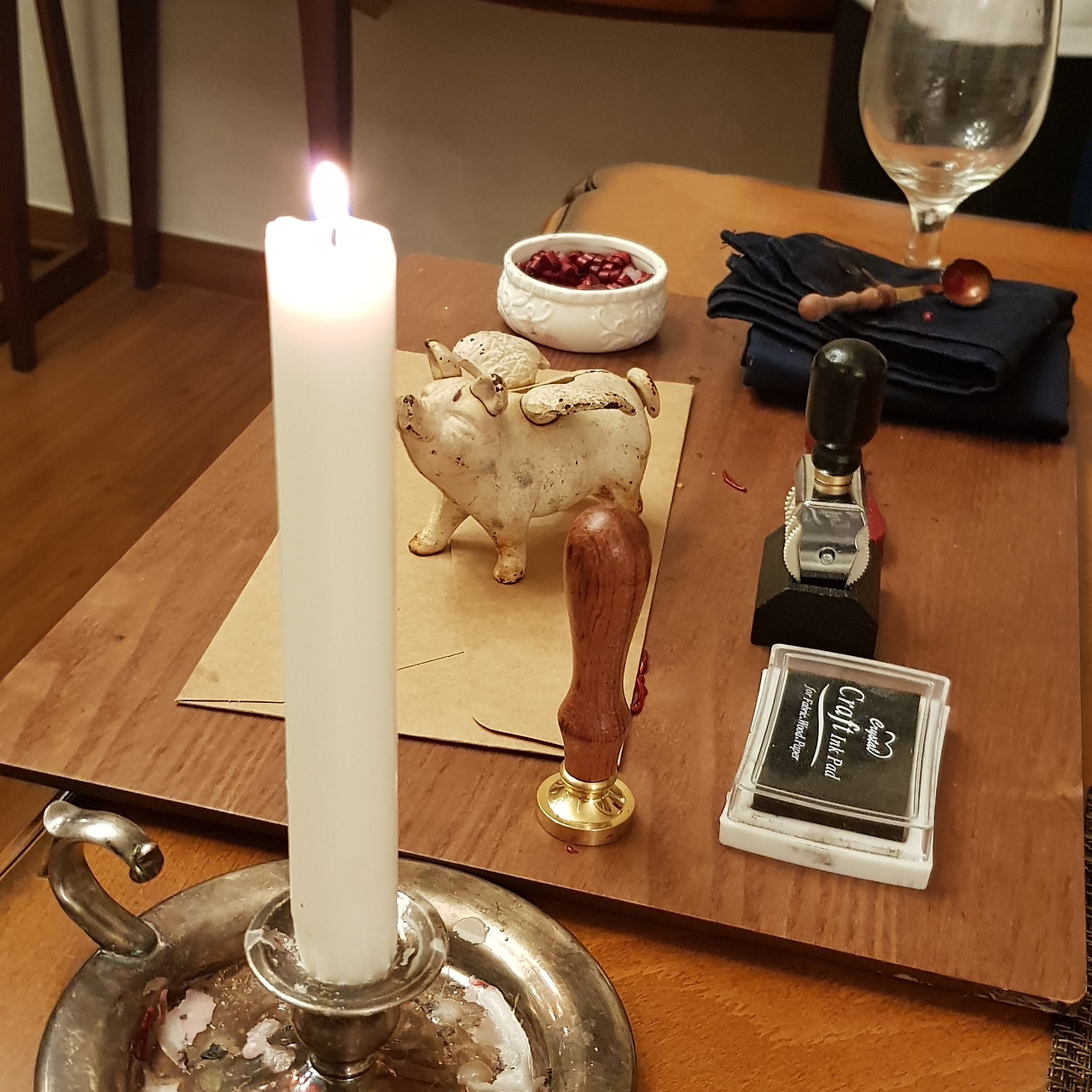 모든 식사가 마친 후 각 메뉴가 서브될 때마다 함께 제공되었던 네이밍 카드와 셰프의 코멘트를 모아서 봉투에 담아 준다. 그리고 밀랍을 녹여 봉인, 르꼬숑의 문장과도 같은 '드러눕돼지' 형상의 스템프를 찍어 준다. 마지막 이벤트 하나까지 세심하고 위트가 있어 좋았다.