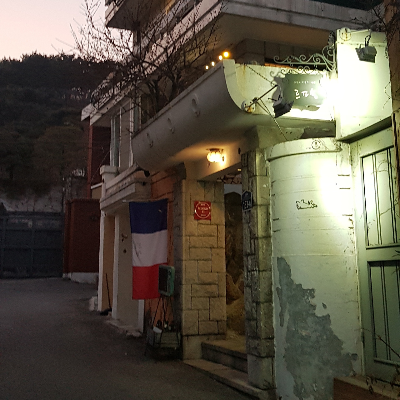 찾기는 쉽지가 않다. 그냥 일반 슬라브식 가정집을 식당으로 사용하는 것이라 외관이나 인테리어가 뛰어난 것은 아니다. 입구에 걸려있는 프랑스 국기가 프렌치 레스토랑임을 항변하고 있다고나 할까? ㅎㅎㅎ