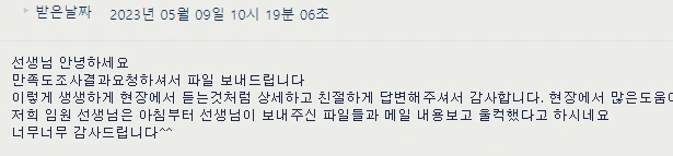 선생님, 요청드린 질문에 대해 이렇게 생생하게 현장에서 듣는 것처럼 상세하고 친절하게 답변해 주셔서 감사합니다. 저희 임원 선생님은 아침부터 선생님이 보내주신 파일들과 메일 내용보고 울컥했다고 하시네요.