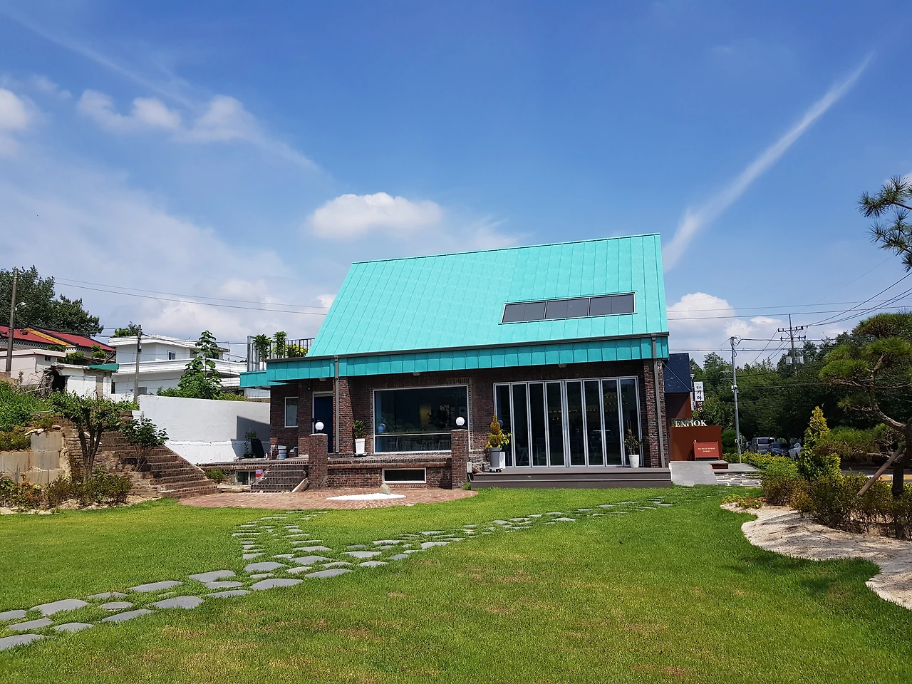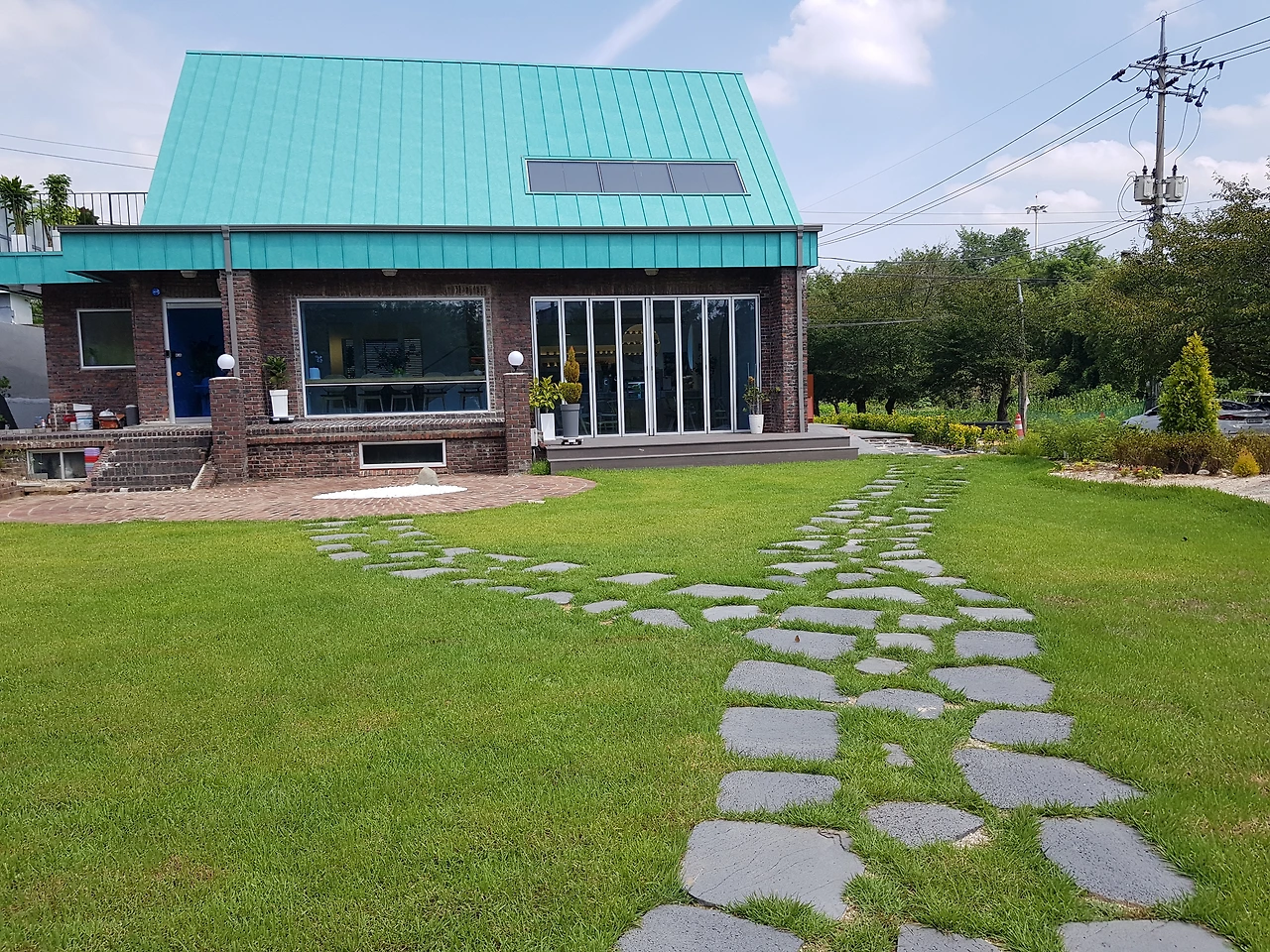 파릇한 잔디와 파란 하늘사이 하늘색 지붕 와 ~ 절묘하네요!