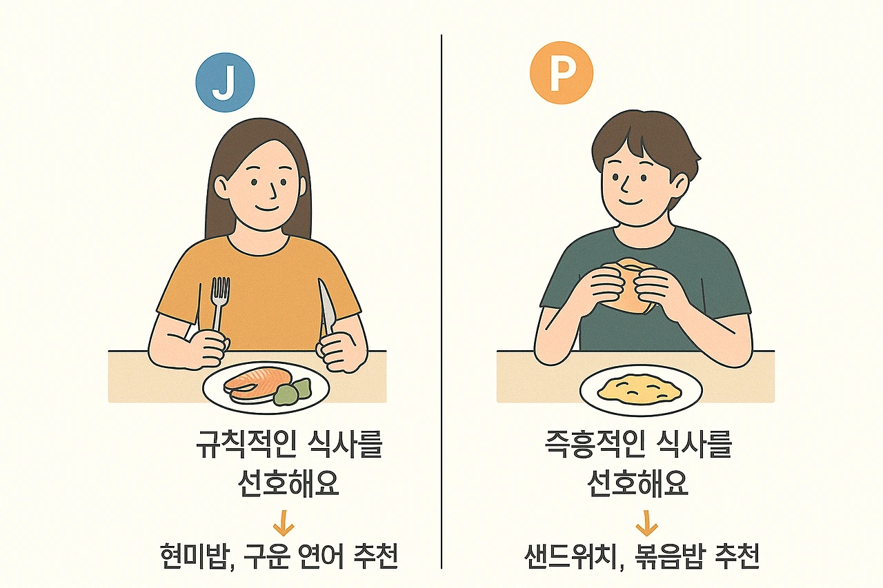 판단형 (J) 식단표가 있어야 안심돼요. 계획된 식사가 좋아요. → 밀프렙, 주간 식단, 규칙적 식사 추천