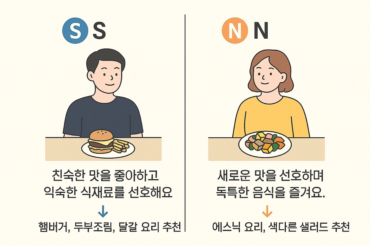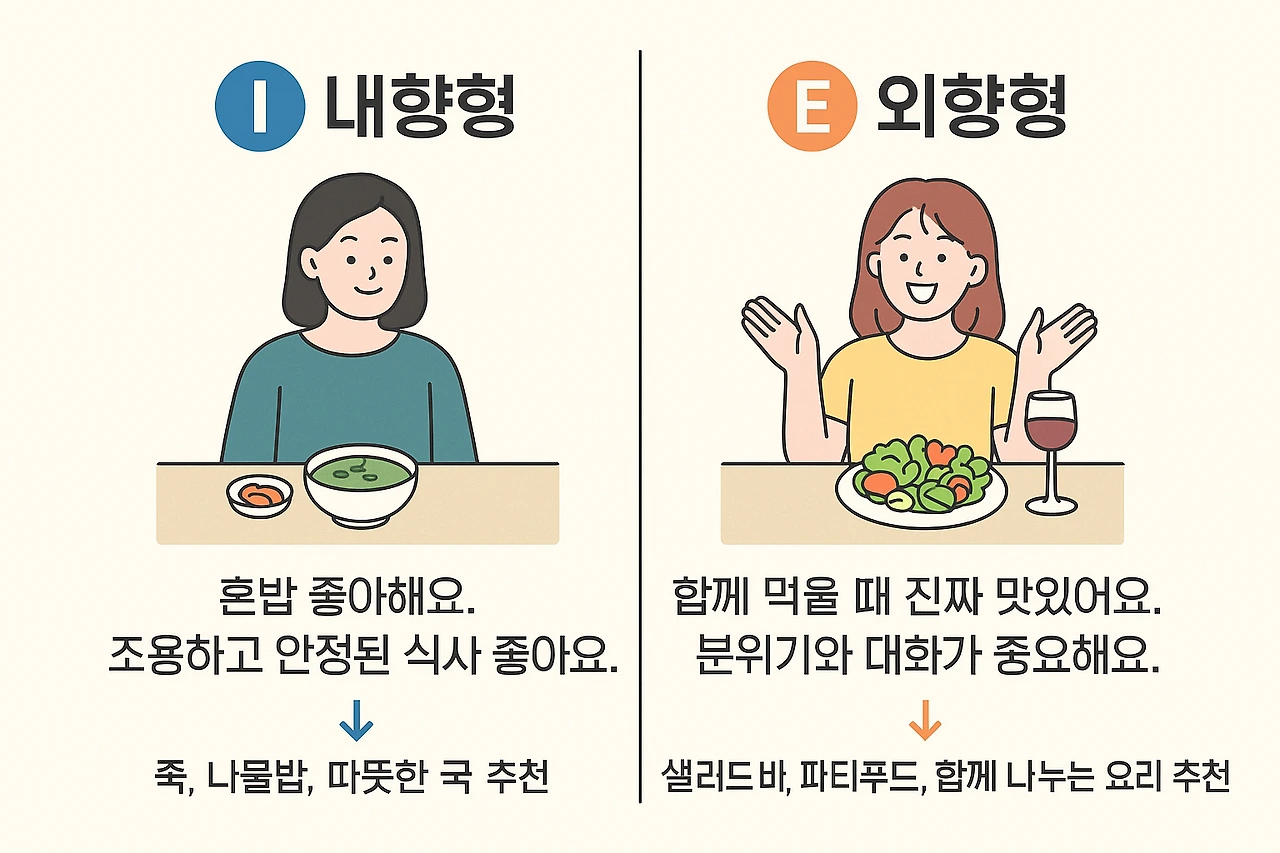 외향형 (E) 함께 먹을 때 진짜 맛있어요. 분위기와 대화가 중요해요. → 샐러드 바, 파티푸드, 함께 나누는 요리 추천