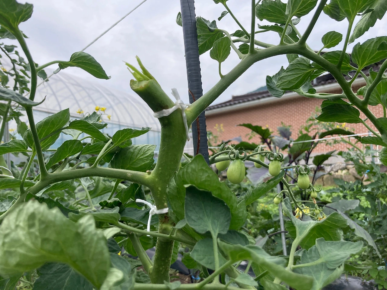 키가 부쩍 자라 버린 토마토들도 한 번 더 묶어주기로 했다. 어렸을 때부터 차례로 끈을 잘 묶어준 토마토들은 줄기를 위로 곧게 잘 뻗었다. 그런데 유독 하나가 이리저리 휘어져 지지대 저 반대쪽으로 머리를 기울이고 있었다. 아마 아래쪽 어디에선가 묶어줘야 하는 시기를 잠깐 놓친 사이에 바깥으로 기울어져 버린 것 같다. 지지대에서 너무 멀어지면 묶어주기도 힘들고 잎사귀들이 길을 침범해 고랑으로 지나다니기도 힘들어지니까 이번엔 좀 붙여줘야겠다고 생각했다.