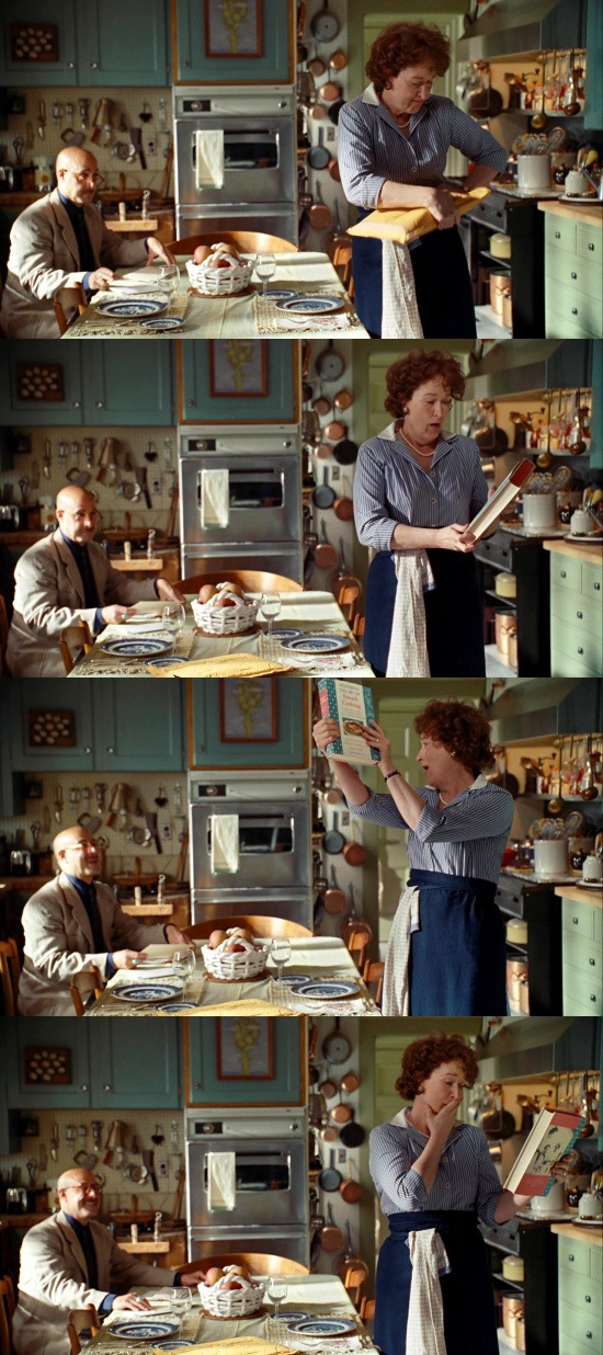 예상치 못하게 자신의 책을 보게 돼 너무나 감동받은 줄리아의 표정과 그것을 알고 지켜보는 폴의 표정.