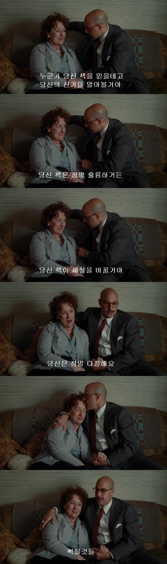 살아가다 보면 언제나 좋은 일만 있는 것은 아니기에 그들에게도 어려움은 온다. 줄리아는 아이를 원하지만 갖지 못하고, 동생의 임신 소식을 듣고는 축하와 서러움이 엉긴 눈물을 흘린다. 폴은 평생을 바쳐 일한 나라에서 자신의 경력을 의심하며 며칠을 갇혀 심문을 받고, 줄리아가 친구들과 8년의 시간을 들여 쓴 책은 출판사마다 거절당한다. 그럴 때마다 그들은 함께한다. 위로하고 안아주고 힘이 되어준다. 심문을 받은 뒤 자신의 평생의 헌신이 무엇을 위한 것인지, 자신에게는 무엇이 남는 것인지 모르겠다며 힘들어하는 폴에게 줄리아는 말한다. 내가 쓰고 있는 이 책은 '우리의 책'이라고. 당신이 없이는 할 수 없었을 것이라고. 그리고 거절당하는 것에 지친 줄리아에게 폴은 말한다. 누군가 당신의 책을 알아볼 것이라고. 그 책이 세상을 바꿀 것이라고. 그리고 그녀의 책을 몰라보는 이들에게 시원하게 말한다. 썩을 것들.