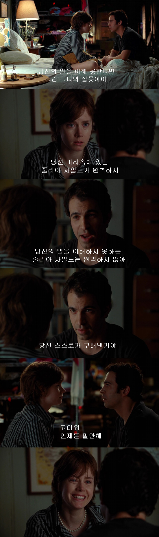 나는 받아들일 것은 받아들이고 좋은 것은 주고받으며 함께 성장하는 관계를 꿈꾸기에 줄리아와 폴의 관계를 더욱 원한다. 하지만 사실 나의 수준은 줄리와 비슷하다. 착하고 소심하지만 신경질적인 상태. 나도 묻어둔 꿈이 있고 그것을 실현할 방법은 찾기 어려우며(혹은 준비가 덜됐거나) 상대가 주는 사랑과 도움을 당연한 것으로 여기거나 제대로 받을 깜냥이 안 되는 때도 있다. 그리고 그런 방식으로 상처를 주기도 한다.
