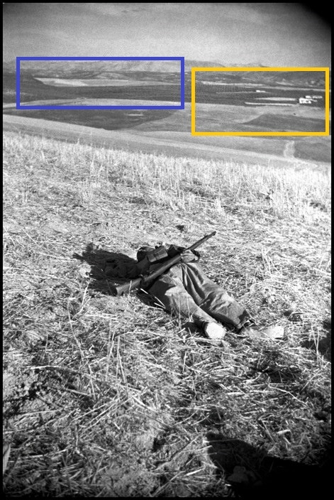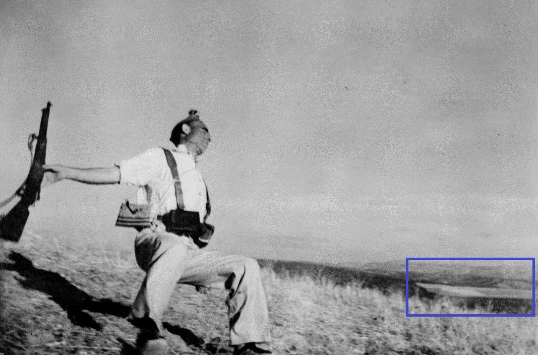 매그넘은 위 흑백사진 3점이 모두 세로 무리아노(Cerro Muriano)에서 촬영되었다고 지금까지도 그들의 홈페이지에 기록하고 있다. 자 이제 흑백 사진 3장과 실제 에스페호(Espejo)(컬러사진)에서 촬영된 사진을 비교해보자. 파란색, 빨간색, 노란색으로 칠한 뒷배경들을 유심히 비교해보면, ‘쓰러지는 군인’ 사진은 실제로 세로 무리아노가 아닌 에스페호에서 촬영되었을 가능성이 높음을 재차 확인할 수 있었다(참고자료 10: Caroline Angus Baker, 2016).
