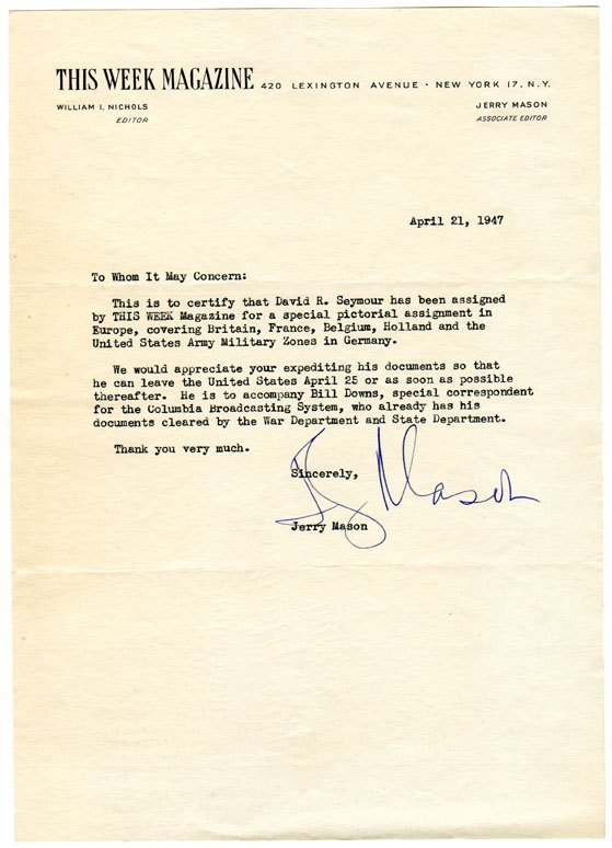 1947년 미국 잡지 This Week 지는 제2차 세계 대전 종식 2주년 기념 보도를 위해 데이비드 시모어를 유럽으로 급파했다. 탐사보도 프로젝트 ‘We went back’의 일환이었다. 2차 세계대전 당시 노르망디부터 베를린으로 이어졌던 연합군의 진격로를 그대로 따라가며 전쟁의 상흔(傷痕)을 사진으로 담아내는 것이 프로젝트의 목표였다.