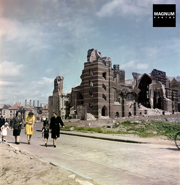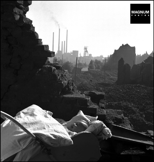 네덜란드를 지나 'We went back' 프로젝트의 마지막 여정지인 독일 베를린으로 향하는 길목인 에센(Essen:지명)에서 찍은 사진이다. 검게 그을린 폐허 속 건물들 앞으로 유모차를 탄 한 아기가 눈에 들어온다. 매그넘 홈페이지에 사진 캡션은 이 아기를 "어느 영국 군인의 사생아"라고 설명한다. 전쟁이 끝난 지 2년이 지나도록 저 아기가 영국군 아버지를 따라 모국으로 가지 못하고 독일에 남은 이유가 무엇일까? 혹시 영국군이었던 아버지는 전쟁 중 사망한 것일까? 저 아기 엄마는 누구인가? 열심히 자료 조사를 해봤지만 사진 캡션 외에 저 아기의 신원을 확인해주는 자료를 찾아내지 못했다.