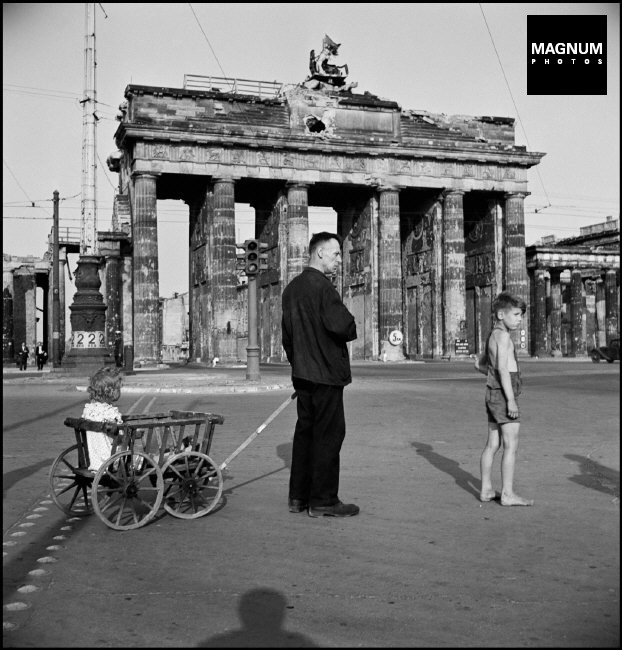 마침내 도착한 독일 베를린의 모습. 뒤쪽에 보이는 건축물은 나치가 정권을 잡았을 때 나치당(Nazi party)의 상징처럼 여겨졌던 브란덴부르크 문(Brandenburg Gate)이다. 이 문의 가장 꼭대기 부분에 원래 위치해 있어야 할 4마리 말이 이끄는 승리의 여신이 탄 마차가 전시 폭격에 의해 유실된 모습은 패전국 독일을 상징처럼 보여준다. 그 앞을 지나가는 한 남자와 그의 자녀들의 모습 그리고 이 모든 걸 지켜보는 데이비드 시모어 자신의 그림자가 꽤 인상적으로 다가온다.