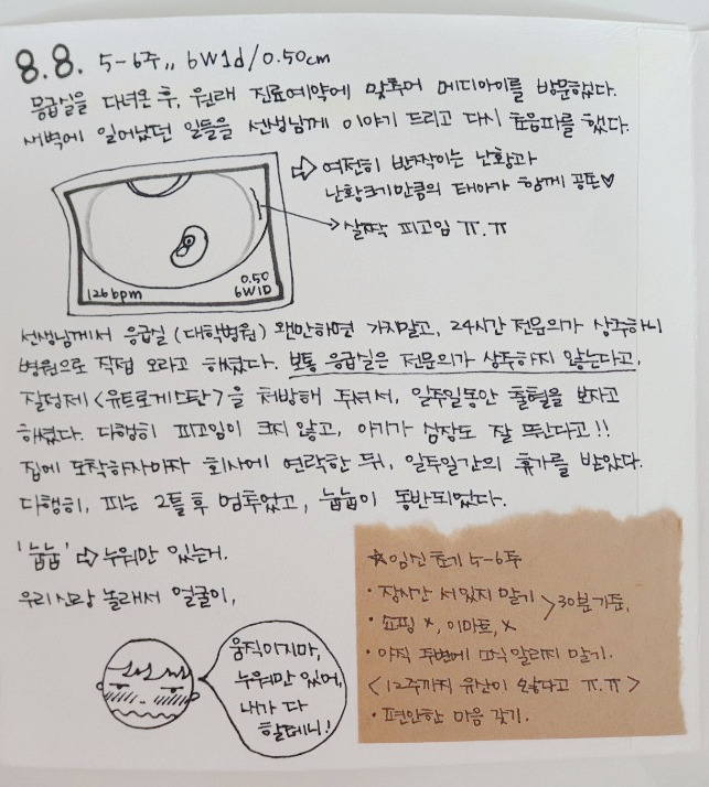 선생님께서는 아기는 다행히 심장이 잘 뛴다고 하시고, 이런 이벤트가 지나가는 산모들이 의외로 많다며 80프로 정도는 이런 이벤트가 있어도 막달까지 잘 아기를 낳는 산모가 있다고 하셨다. 피가 많이 나오는 것이 아니지만 피고임이 있으므로 쉬면서 경과를 지켜보는 게 좋겠다고 하셨고,