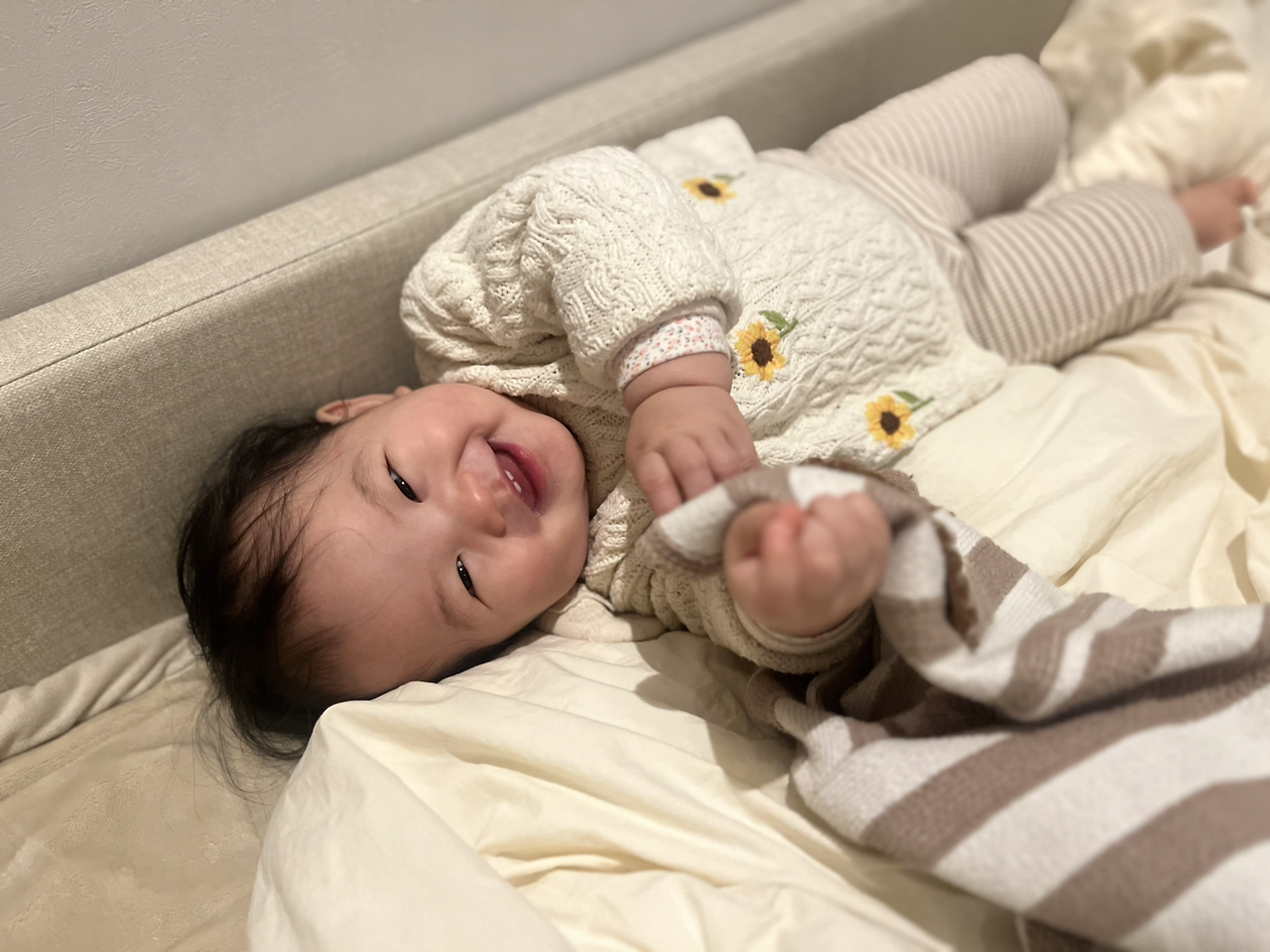 한 살이 주는 귀여움은 엄청나다. 이때만 느낄 수 있는 특유의 귀여움이 있다. 일단 다리가 핵심인데, 코끼리 다리처럼 통통하고 짧동한 게 너무나 귀엽다. 만약 이게 어른의 다리라면 너무 통통하다고 할 만한 다리일 수도 있지만, 아기의 몸에서는 그저 너무 귀엽기만 한 포인트가 된다. 아기는 누워서 다리를 하늘 위로 드는 자세를 자주 취하곤 하는데, 아니 벌써 여기서 끝난다고? 싶게 금방 끝나있는 이 다리 길이도 너무 귀엽게 느껴진다. 또 발도 어찌나 귀여운지… 마치 어른으로 치자면 벌에라도 쏘여 퉁퉁 부은 발 같은데, 그것도 너무 귀엽다. 퉁퉁하고 쪼그만 발… 그 발이 너무 사랑스러워 나는 늘 아기의 발에 뽀뽀를 하고 냄새를 킁킁 맡는다. 아기의 배도 얼마나 귀여운지 모른다. 이래도 되는 건가 싶을 정도로 뽈록 나와 있는 그 아기 특유의 모습이 너무나 사랑스럽다. 아기의 손과 내 손을 깍지를 끼면 마치 여린 나뭇잎을 만지는 것처럼 더없이 부드럽고 야리야리하여 ‘이게 손이라니…’ 하며 새롭게 느껴지고, 아기의 곱고 여린 머리칼은 꼭 바람에 흩날리는 버드나무의 잎 같다. 참으로 사랑스럽다. 아기의 피부는 말할 수 없이 희고 보드랍고 탱글탱글하다. 그래서 아무리 예쁜 옷을 입혀놔도 솔직히 몸 그 자체보다 예쁘지 않다 느껴질 정도다. 참 예쁘다는 생각이 절로 들게 하는 나이, 한 살이다.