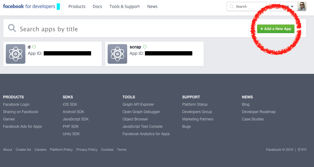 https://developers.facebook.com/apps 에서 <+Add a New App> 버튼을 누르고 만들면 된다.