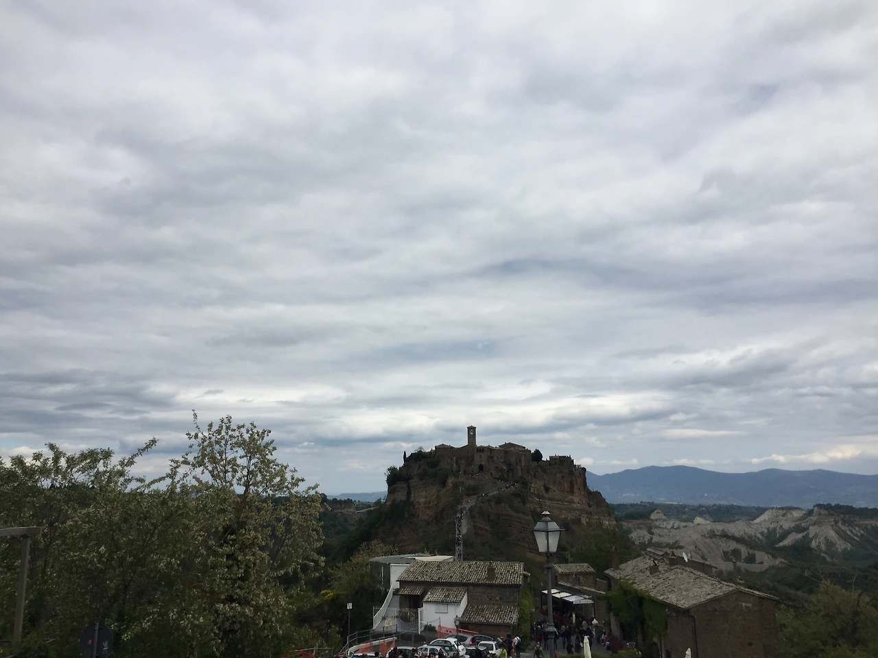 2시간 정도 차를 달려 치비타(Civita)에 도착했다. 바뇨레조(Bagnoregio)마을의 주차장에 차를 세우려는데 유료주차장에 자리가 없다. 사람들도 바글바글하다. 5월 1일 근로자의 날이어서 그런지 가족단위로 놀러 온 이탈리아 사람들이 많다. 간신히 차를 대고 현실판 천공의 성이라 불리는 치바타를 향해 걸어가는데 이제는 먹구름까지 몰려온다. 어제 여름 같았던 그 날씨는 어디로 갔는지 순식간에 '미스트랄'을 능가하는 바람이 휘몰아치기 시작한다. 언덕 꼭대기에 작은 마을이 천공의 성처럼 떠있는데 언덕 아래 계곡은 바람과 비의 풍화작용에 의해 점점 깎여 그런 모습을 가지게 되었다고 한다.