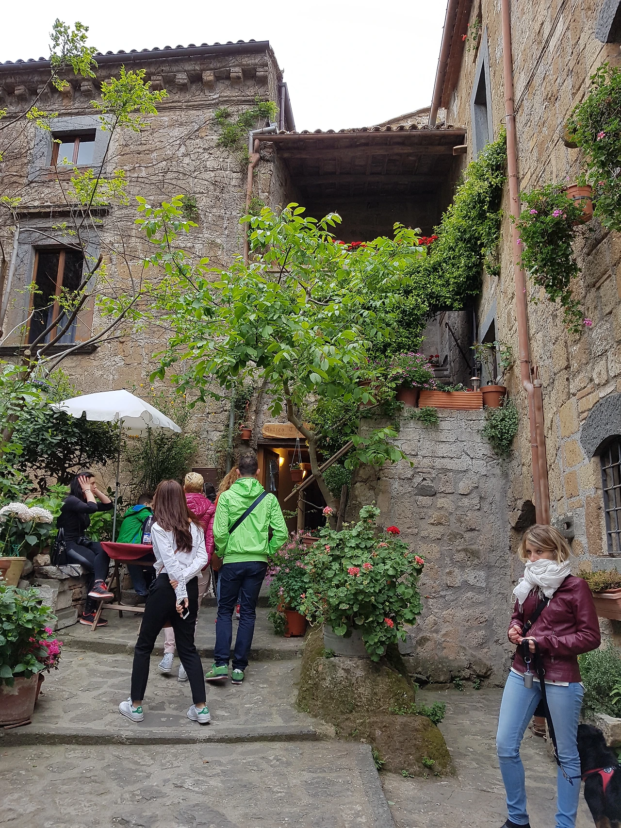 이 마을에 들어가기 위해서는 긴 다리를 건너야 하는데 (마을 입장료인지 다리 통행료인지 알 수 없으나 여하튼 유료!) 다리의 길이가 제법 길고 가파른 낭떠러지를 가로지르는 다리인지라 난간 가까이에 서면 꽤나 아찔하다. 거기다 칼날 같은 미스트랄이 한번 불면 몸이 휘청이며 금방 다리 가장자리로 밀려날 것 같다. 한겨울 같은 추위가 느껴진다. 다리에 서서 치비타를 배경으로 기념사진을 찍기는커녕 살려달라고 비명을 지르며 건너가기 바빴다. 다른 사람들도 바람에 같이 휘청거리며 외마디 비명을 지르며 뛰어간다.