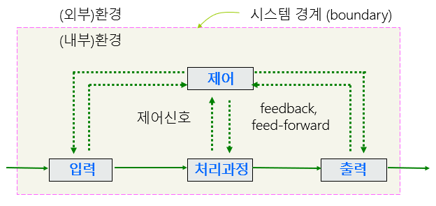 ‘제어’는 피드포워드(feed forward)와 피드백(feedback) 2가지로 나눌 수 있는데 전자는 미래지향적 아이디어나 해결책을 찾는 식의 정(正)방향 흐름을 강화하는 것이고 후자는 이미 실행한 결과물의 부족한 점을 보완하기 위해 흐름을 역(逆)방향으로 되돌리는 것이다. 하나의 시스템은 결과적으로 여러 구성품이 가진 역량을 합친 것 이상(또는 이하)의 결과를 만든다. 구성품 간 상호작용을 통해 양(+) 또는 음(-)의 시너지(synergy)가 발생한다는 것이다. 해결해야 할 문제의 범위를 ‘경계’로 설정함으로써 내부와 외부 즉, 통제 가능 영역과 통제 불능 영역을 나누게 된다. 외부와 상호작용이 가능할 경우 열린(open) 시스템이고 상호작용이 불가능한 것은 닫힌(closed) 시스템이다.