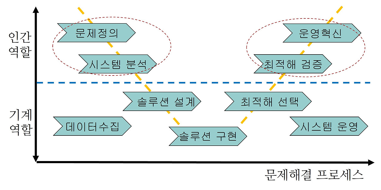 문제 해결 프로세스는 일반적으로 문제 정의, 대상 시스템 분석, 해결방안(solution, alternatives) 모색/개발, 최적해 선택 및 적용, 시스템 운영 및 개선 등의 과정을 거치게 된다. 제조 공정에서 로봇이 인간보다 더 가공/조립을 잘한다면, 인간 작업자는 제품기획/설계와 고객 상호작용을 통해 제품/서비스를 혁신하는 역할로 옮겨 가야 한다. 마찬가지로, 향후 인간 전문가는 AI나 로봇이 담당하거나 도와줄 ‘솔루션 개발-구현’ 단계보다는 그 앞부분과 뒷부분에서 인간의 통찰과 창의력이 필요한 작업을 담당하는 쪽으로 역할을 전환해 가야 할 것이다(아래 <그림> 참조).