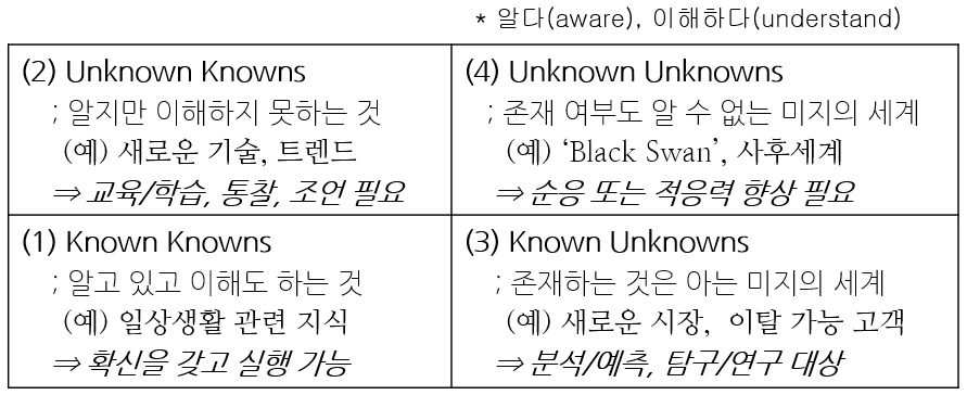 어떤 문제를 놓고 안다, 모른다를 얘기할 때, ‘럼스펠드(Rumsfeld) 매트릭스’로 불리는 4가지 유형의 지식세계를 고려해야 한다. 나 또는 우리의 지식세계는 (1) 알려진 세계를 이해하는 것(‘known knowns’), (2) 알려진 세계지만, 이해하지 못하는 것(‘unknown knowns’), (3) 미지(未知)의 세계지만, 존재한다는 것을 아는 것(‘known unknowns’), (4) 미지의 세계이면서 존재 자체도 모르는 것 (‘unknown unknowns’) 등으로 나눌 수 있다. 참고로, 이는 NASA에서 통용되던 분류 방식인데 미국 국방장관이던 도날드 럼스펠드가 (4)번 즉, 예측 불가능한 상황을 언급함으로써 널리 알려졌다고 한다.