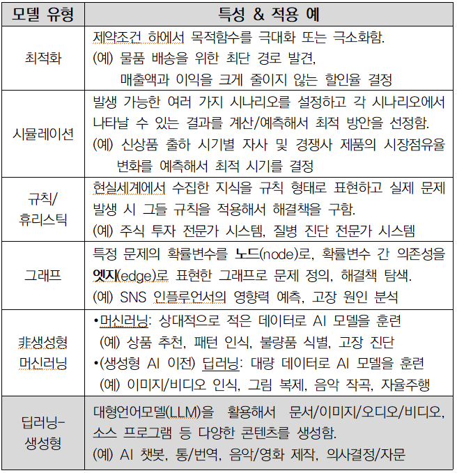 Tao(2024)는 실무에서 활용하는 형태를 기준으로 지금까지 등장한 AI 모델 유형을 최적화, 시뮬레이션, 규칙 기반, 그래프, 비(非)생성형 머신러닝, 생성형 모델 등 6가지로 분류하였다(<표 6.2> 참조).
