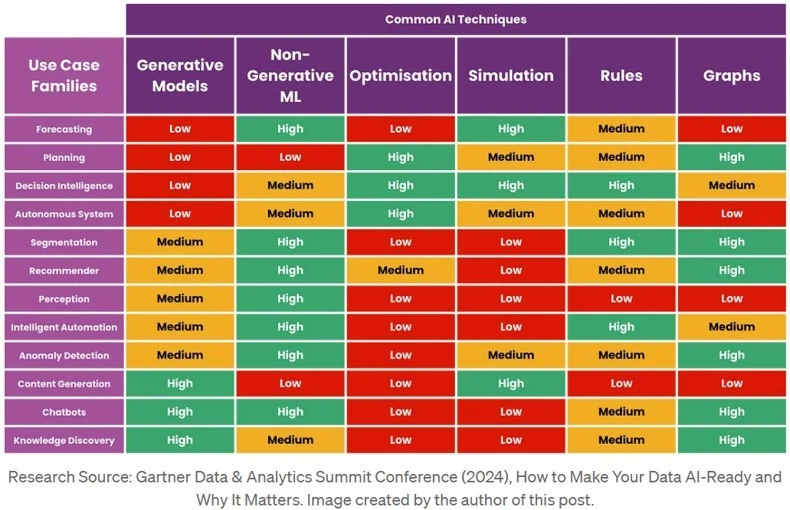 <표 6.3>에 의하면, 예를 들면, 생성형 AI 모델은 콘텐츠 제공, 챗봇, 지식 발견 등에는 적합하지만, 예측, 계획, 지능적 의사결정, 자율 시스템 등에는 적합하지 않다. 예측 문제에는 종래의 머신러닝이나 시뮬레이션, 계획 문제에는 최적화나 그래프 모델이 적합하다. 최적화 모델은 계획, 의사결정, 자율 시스템 등에는 적합하지만, 그 외의 문제에는 적합하지 않다. 콘텐츠 생성에는 생성형 AI와 시뮬레이션 모델이 적합하고 나머지는 적합하지 않다. 그래프 모델은 예측, 자율 시스템, 인식, 콘텐츠 생성 등을 제외한 나머지 문제에 적합하다. 결론적으로, 특정 AI 모델 유형이 모든 문제에 적합한 것은 아니기에 문제 특성에 맞는 모델을 선정, 활용해야 한다. //
