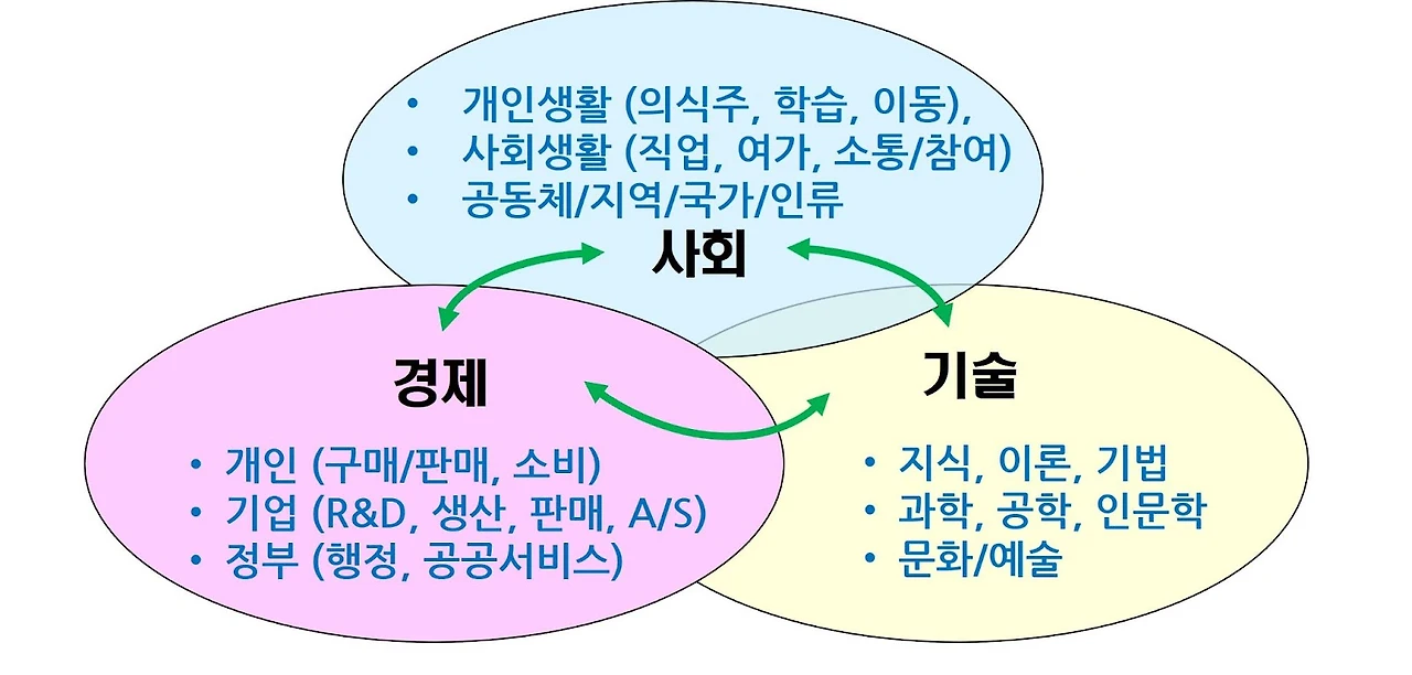 인류 문명 발전을 설명하는 2가지 이론에 의하면 기술 발전에 힘입어서 경제-사회가 바뀌거나 사회적 요구에 부응하기 위해 신기술이 등장하는 식으로 기술-경제-사회 시스템 간 상호작용이 이루어진다(<그림 1> 참조>. 전자는 기술을 독립변수로 보는 기술결정론, 후자는 기술을 종속변수로 보는 사회구성론이다. 2016년 1월, ‘제4차 산업혁명’(4IR)을 주창한 세계경제포럼(WEF)의 클라우스 슈밥은 ‘기술은 정치적(politic)’이라고 하였다. 이를 테면, 기술자, 기업가, 사용자/소비자, 정책수립자 등 이해관계자 중에서 어느 쪽의 파워가 큰가에 따라 기술결정론이 맞을 수도 있고 사회구성론이 맞을 수도 있다는 것이다. 기술-경제-사회 간 힘의 균형에 따라 세상이 달라진다는 뜻이다(참조: 4차 산업혁명의 기회와 위협).