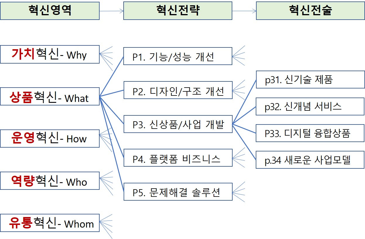 o 상품혁신: 제품의 기능/성능 개선에 초점을 둔 존속적 혁신에서 구조 자체를 변경하는 구조적 혁신, 나아가 새로운 사업모델을 통해 기존 규칙을 바꾸는 파괴적 혁신으로 진화한 것을 반영하였다. 또한, 현재 플랫폼 상품과 BM이 부상하고 있는 가운데 전용/범용 문제해결 솔루션이 조금씩 등장하고 있는 상황을 반영하였다.