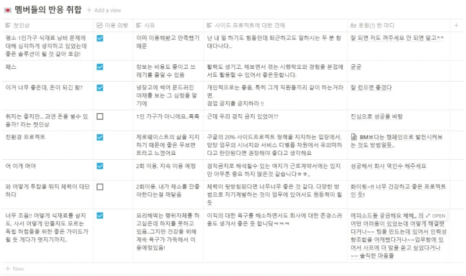 일주일 채소를 5,000원이라는 백반 하나도 안 되는 가격에 해결할 수 있는 서비스라니...! 심지어 장볼 때 덩달아 딸려오는 비닐/플라스틱 포장재가 안 나온다는 점에서도 굉장히 자신감이 넘쳤다. 자취생을 위한 집밥 스타터 키트로 자리 잡겠다는 당찬 포부를 지니고 가장 먼저 회사에 알렸다.