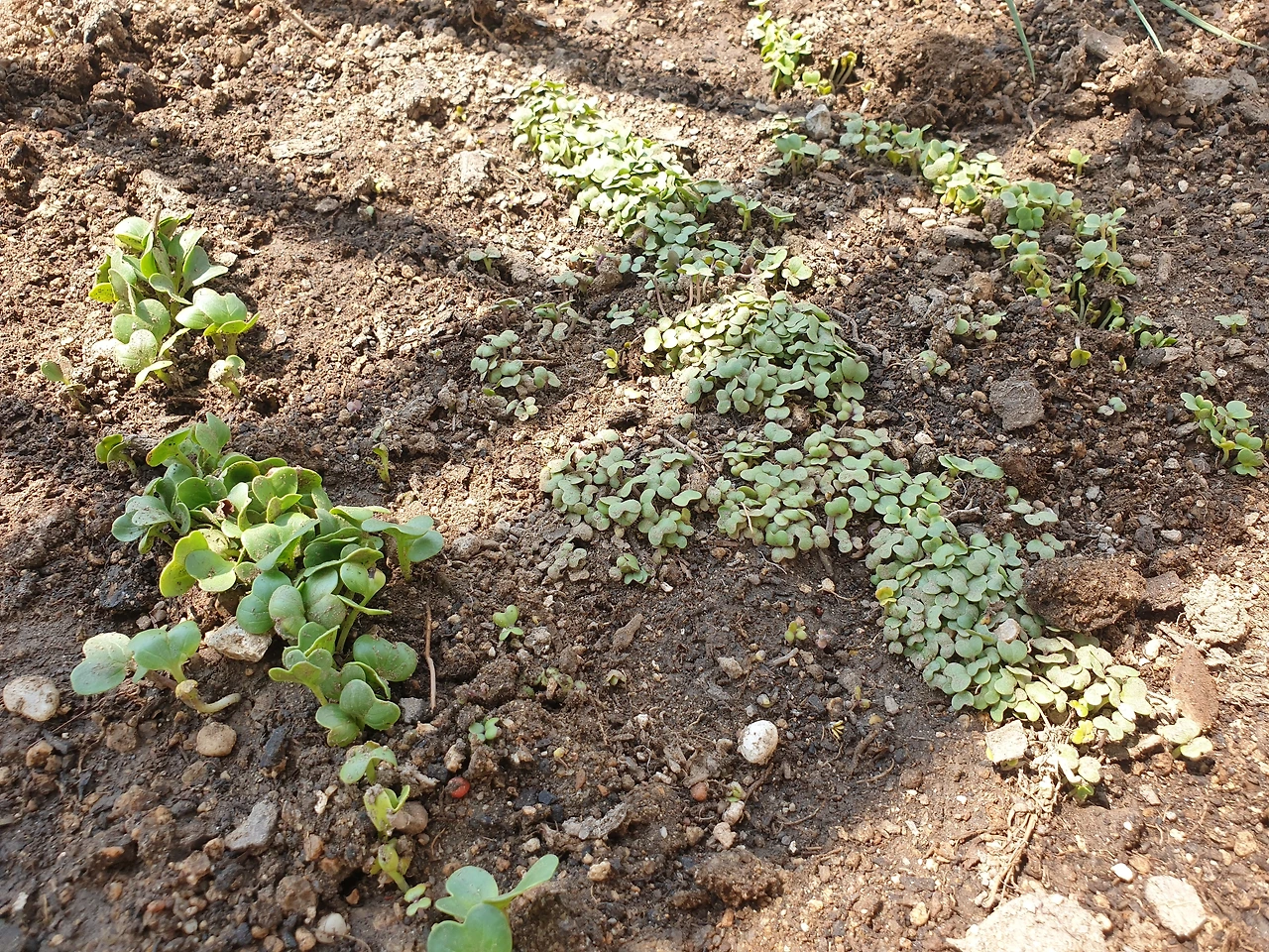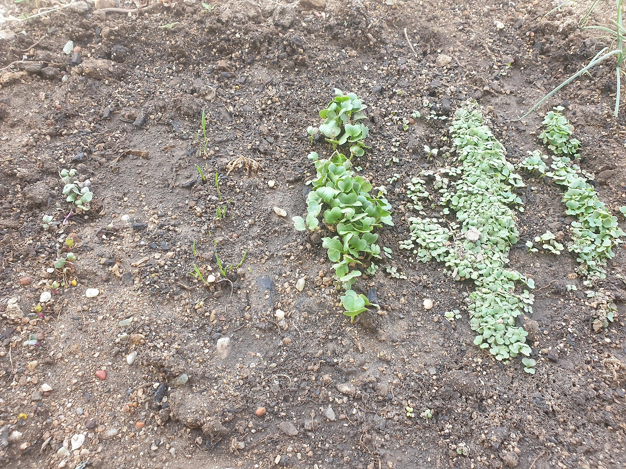 한 달 뒤 날씨가 따뜻해지자 다섯종류가 모두 올라왔다. 왼쪽에 있는 것은 적무, 그 옆이 밀싹 가운데가 무로 추정되는 가운데...