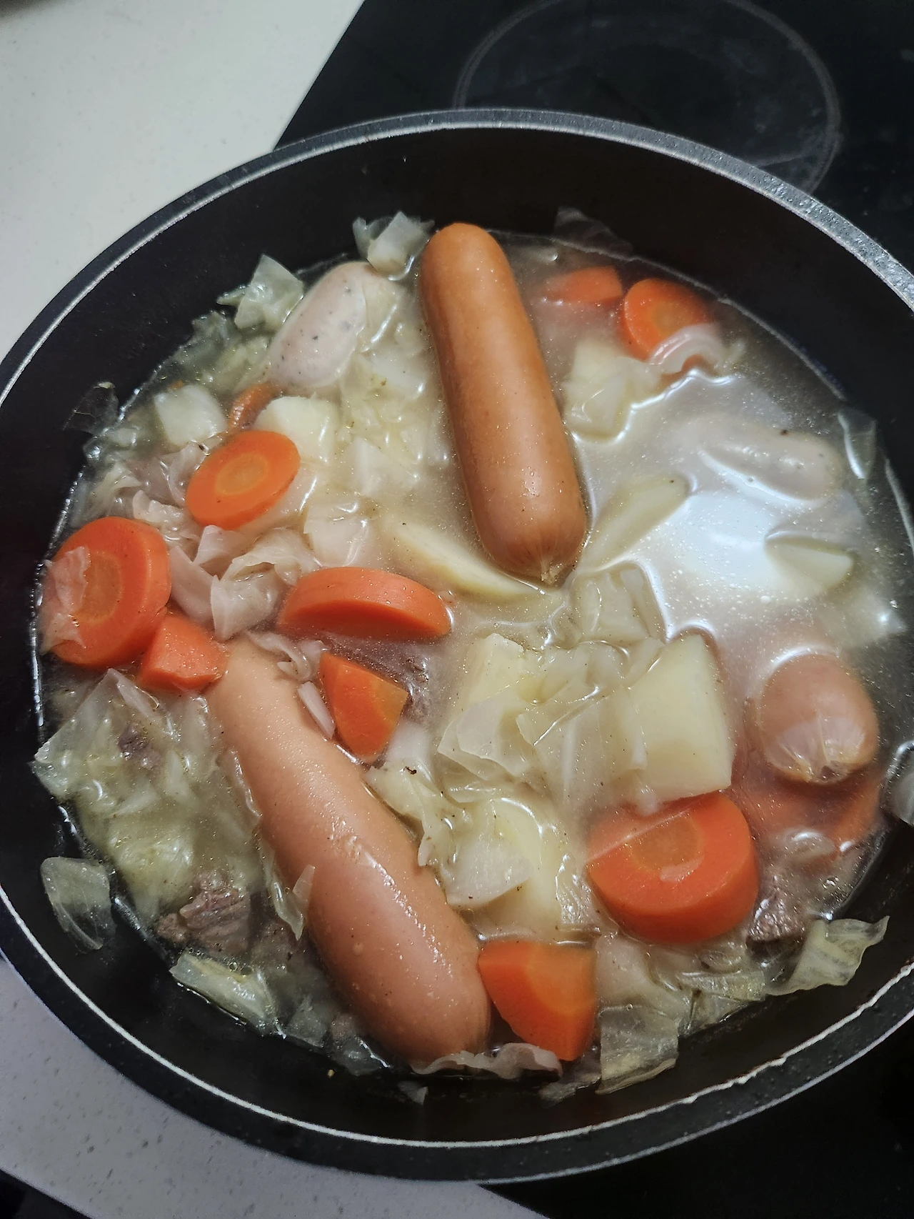 그 이후에 양배추, 당근, 감자를 썰어서 넣고 물을 자박자박할 만큼 넣어 끓이다가 소시지도 함께 넣었다.