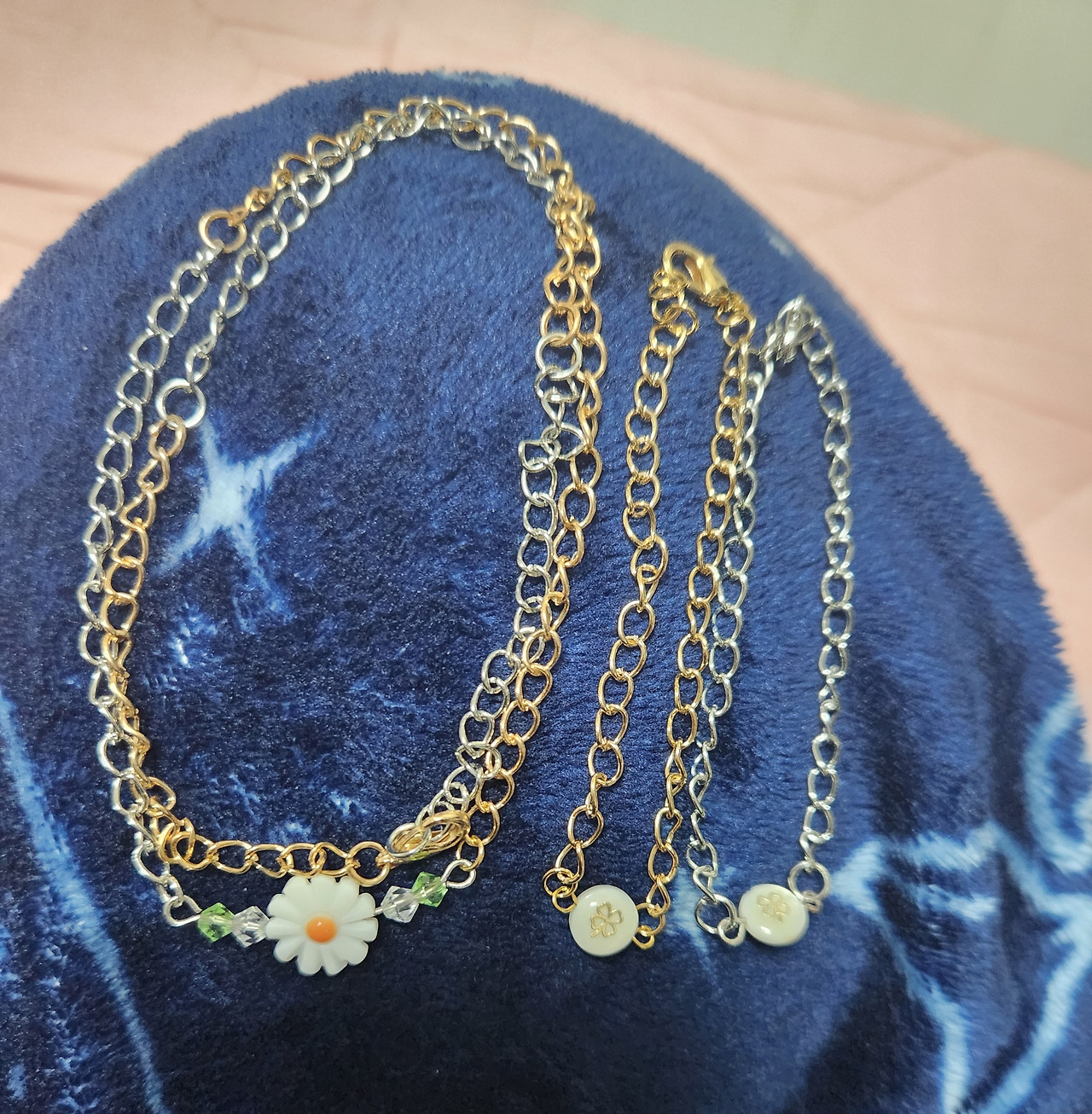 이번에는 네 잎 클로버와 데이지를 포인트로 주자고 생각했고, 체인에 오링을 걸어서 체인을 이어 팔찌와 목걸이의 줄을 먼저 만들었다.