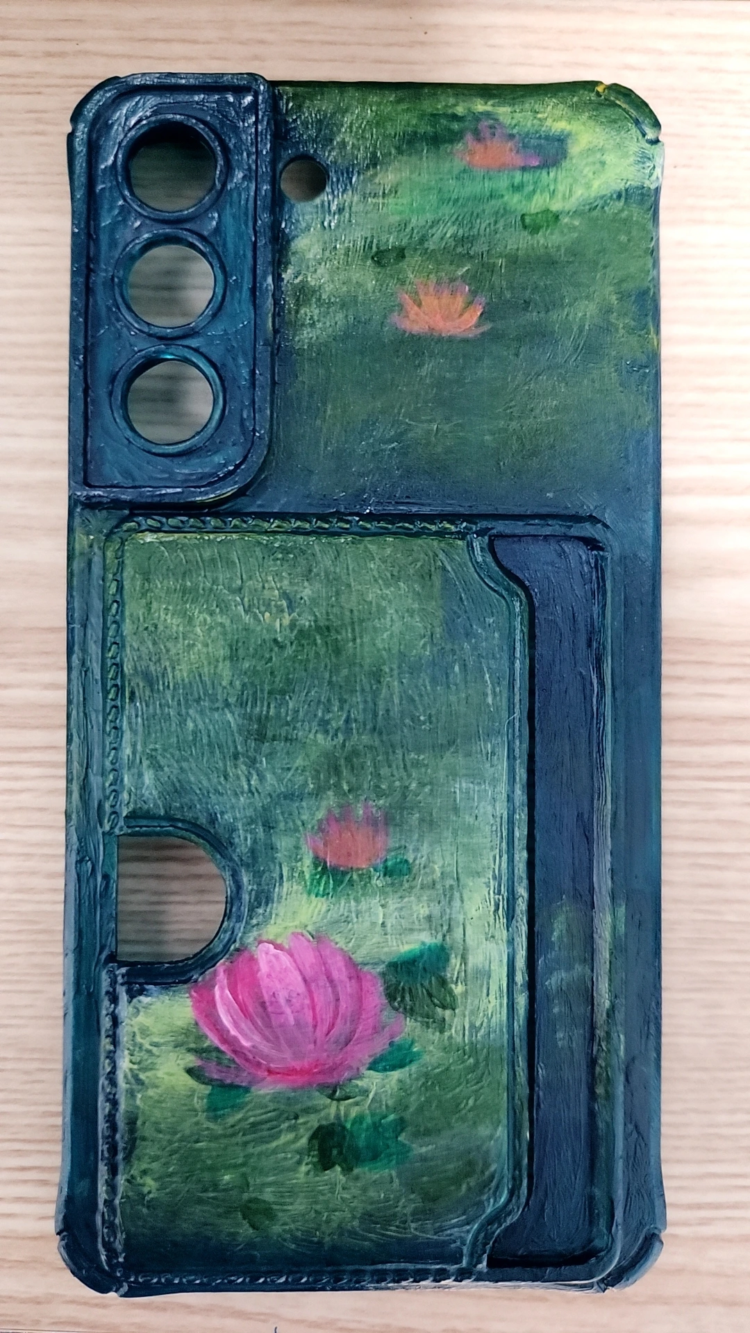 첫 번째 폰 케이스는 파랑과 초록을 섞어서 칠하다 보니 연못의 느낌이 나서 모네의 수련을 떠올렸다. 연잎을 그리고 위에 연꽃을 그렸는데, 가장 아래의 큰 연꽃이 칠하다 보니 망쳐버린 것처럼 느껴졌다. '이걸 어떻게 살리지?' 하다가 덧칠하고 또 덧칠했더니 어영부영 연꽃이 되었다.