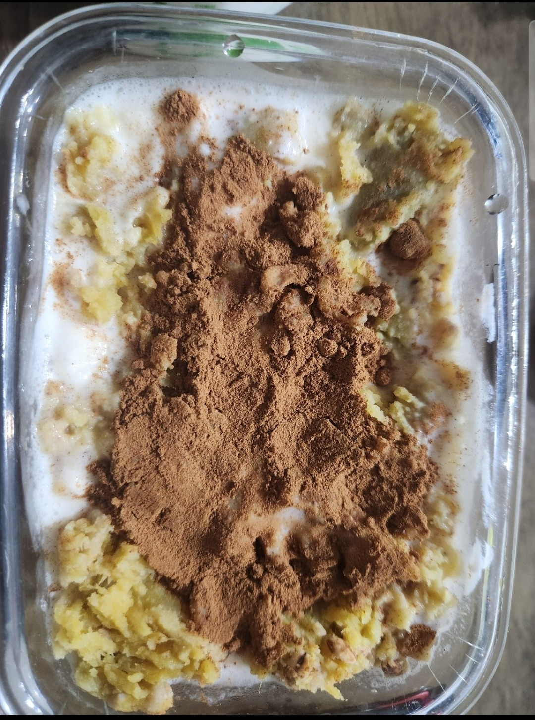 1층인 맨 아래 층은 그릭 요거트 위에 커피에 적신 에이스를 한 겹 올렸다. 2층에는 그릭요거트와 고구마 볼을 으깨어 올렸고, 그 위에 커피에 적신 에이스도 같이 올렸다. 맨 위층에는 저당 바닐라 아이스크림을 올리고 그 위에 고구마볼을 으깨어 올린 후에 계피가루를 뿌리려다가 부어버리게 되면서 모양이 망가졌다.