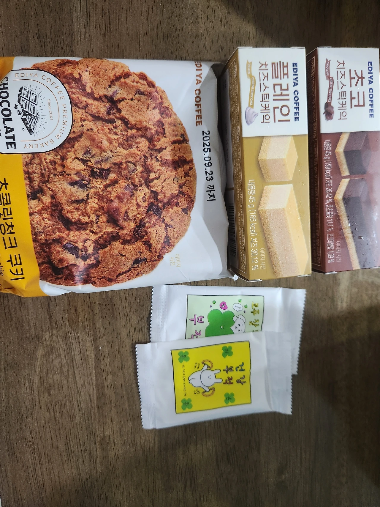 음료는 딸기라떼와 복숭아 아이스티를, 베이커리 메뉴는 세 가지를 필수로 주문해야 했는데, 초콜릿 청크 쿠키, 플레인 크림치즈스틱 케이크, 초코 크림치즈스틱 케이크를 골랐다.