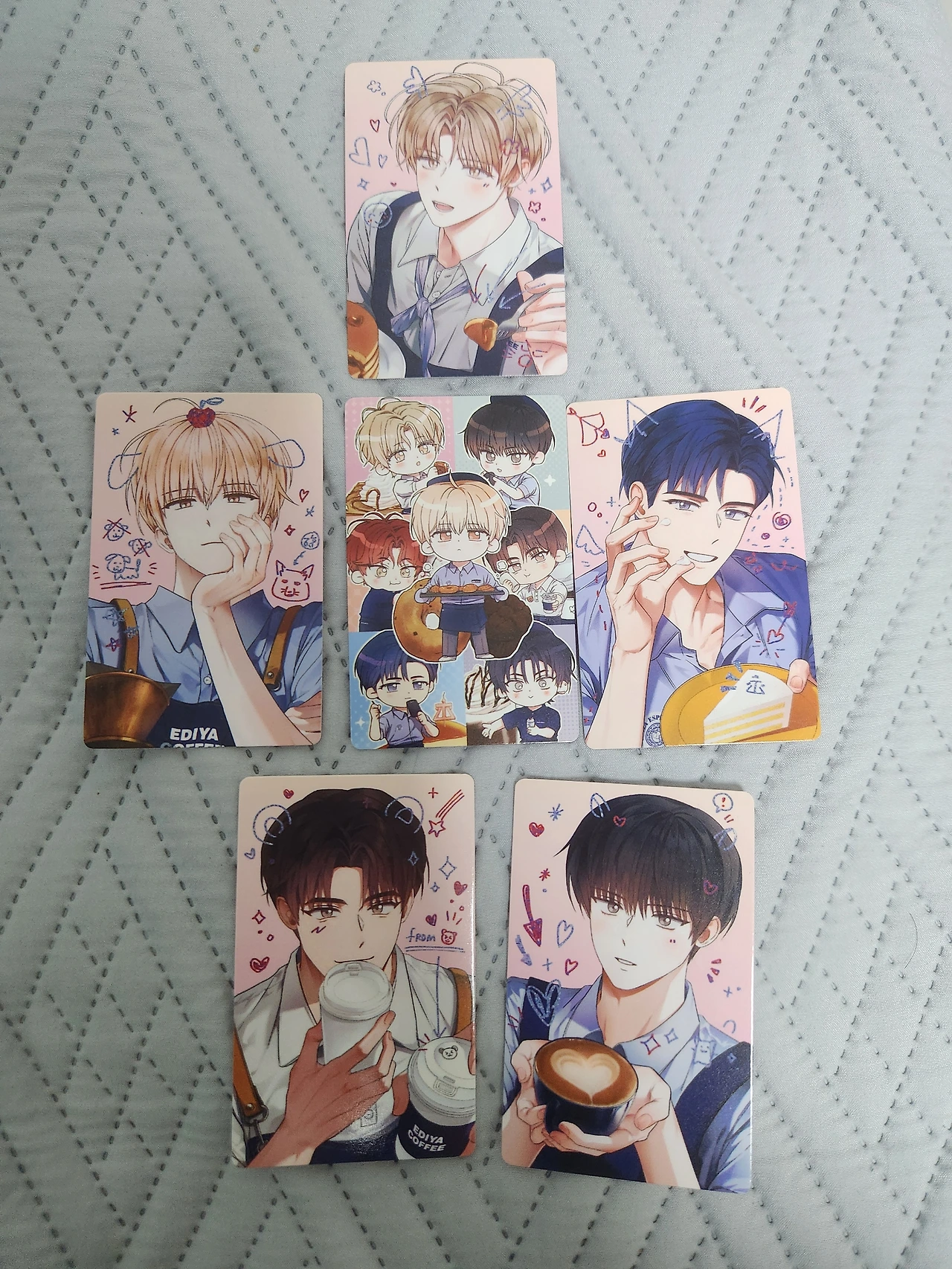 아무거나 바로 눈앞에 있는 걸 집어들고서는 사진 찍을 겨를도 없이 빵부터 먹었다. 베이글이 쫄깃한 게 칼로 잘 썰어지지 않는데, 맛은 있어서 대파 크림 소스를 바르고 그대로 포크로 찍어서 먹을 수밖에 없었다. 어느 정도 먹고 난 뒤에 포토카드가 든 비닐을 열어보자, 청우와 아현이가 있었다.