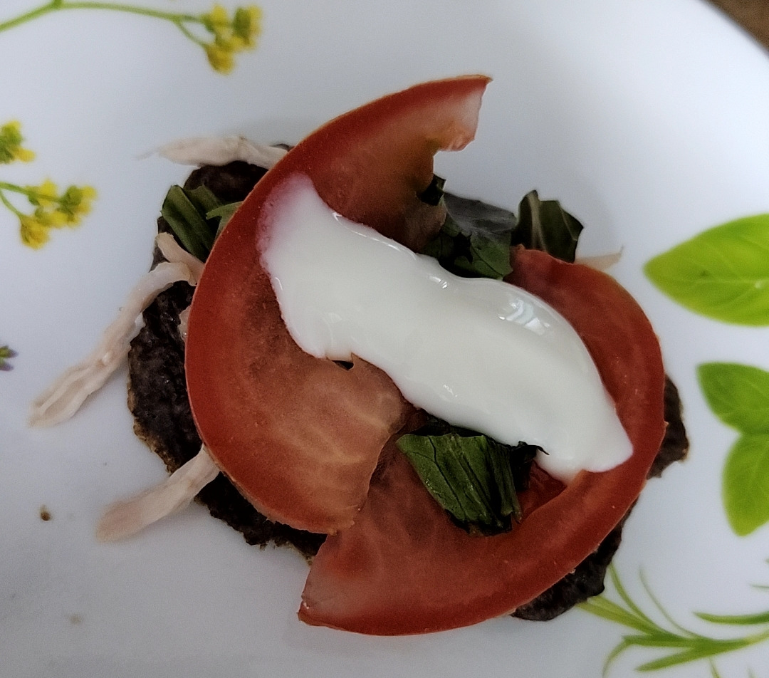 반죽이 떨어지듯 익으면 꺼내 닭가슴살, 채소, 토마토를 얹고